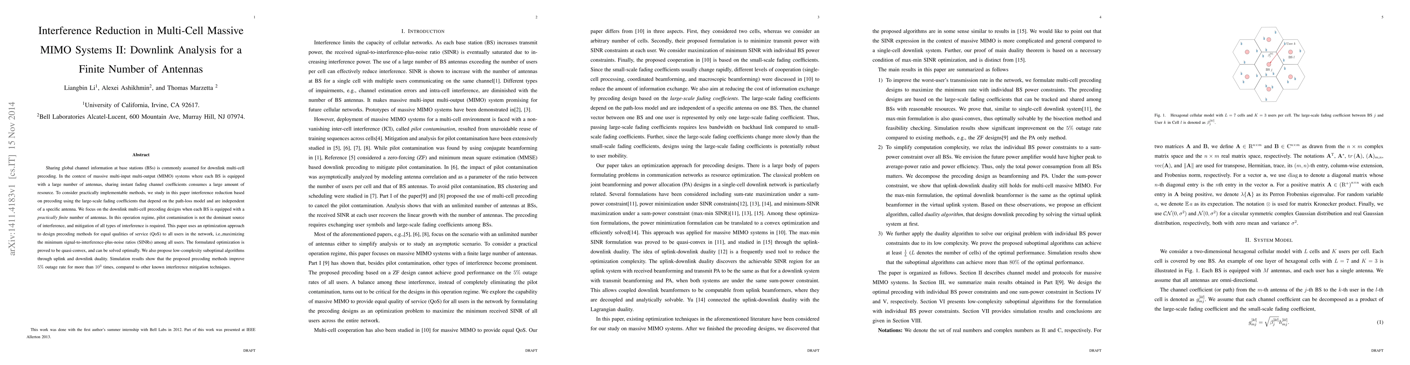 This paper investigates interference reduction in multi-cell massive MIMO systems using precoding based on large-scale fading coefficients, focusing on scenarios with a finite number of antennas. It proposes optimization methods for maximizing minimum SINRs, demonstrating significant improvements in outage rates compared to existing techniques.