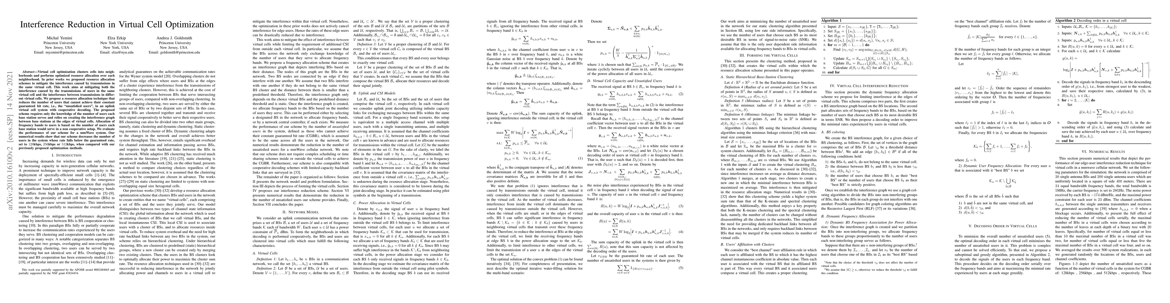 Virtual cell optimization clusters cells into neighborhoods and performs optimized resource allocation over each neighborhood. In prior works we proposed resource allocation schemes to mitigate the interference caused by transmissions in the same virtual cell. This work aims at mitigating both the interference caused by the transmissions of users in the same virtual cell and the interference between transmissions in different virtual cells. We propose a resource allocation technique that reduces the number of users that cannot achieve their constant guaranteed bit rate, i.e., the "unsatisfied users", in an uplink virtual cell system with cooperative decoding. The proposed scheme requires only the knowledge of the number of users each base station serves and relies on creating the interference graph between base stations at the edges of virtual cells. Allocation of frequency bands to users is based on the number of users each base station would serve in a non cooperative setup. We evaluate the performance of our scheme for a mmWave system. Our numerical results show that our scheme decreases the number of users in the system whose rate falls below the guaranteed rate, set to $128$kbps, $256$kbps or $512$kbps, when compared with our previously proposed optimization methods.
