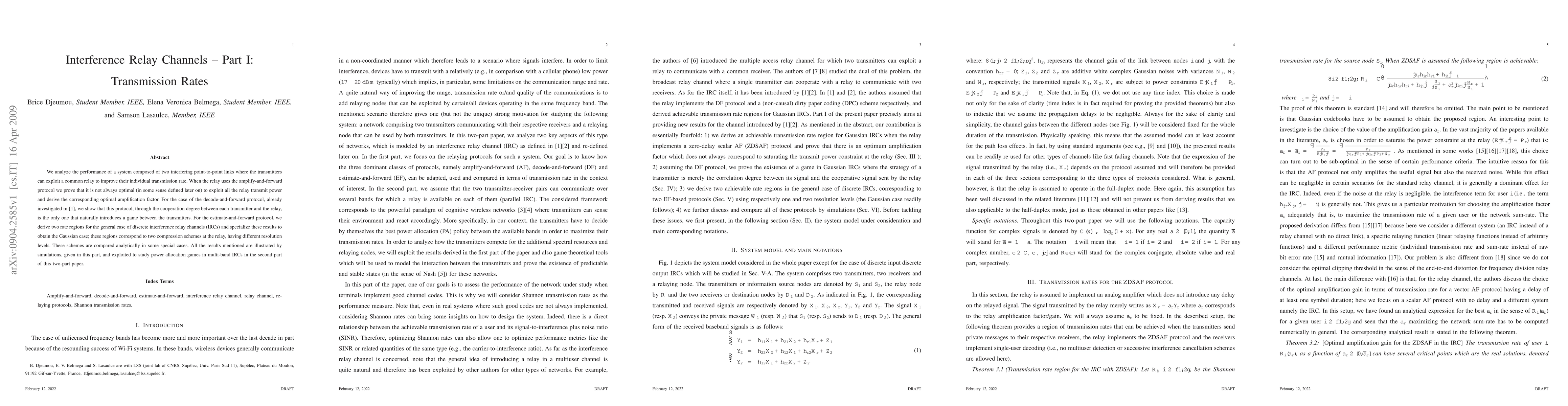 This paper investigates transmission rates in interference relay channels using different relay protocols. It finds that amplify-and-forward may not always use all available relay power optimally, and decode-and-forward introduces a game between transmitters. For estimate-and-forward, two rate regions are derived for discrete and Gaussian interference relay channels, analyzed through simulations and used to study power allocation games.