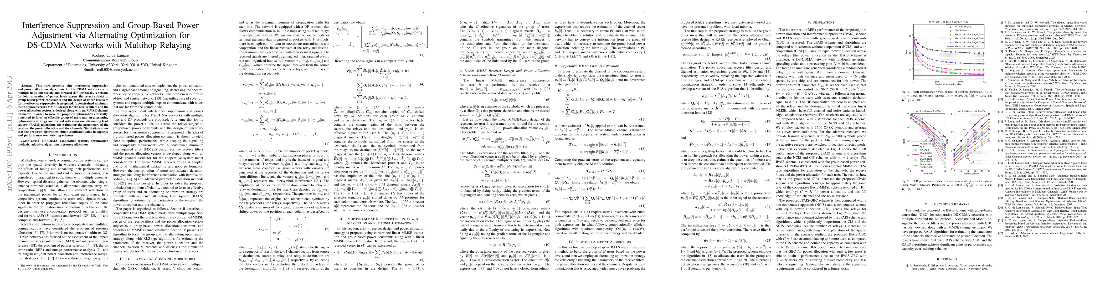 This paper proposes joint interference suppression and power allocation algorithms for DS-CDMA networks with multihop relaying, utilizing group-based power constraints and linear receivers. An alternating optimization strategy with recursive least squares is used to efficiently solve the optimization problem, achieving significant performance gains over existing methods.