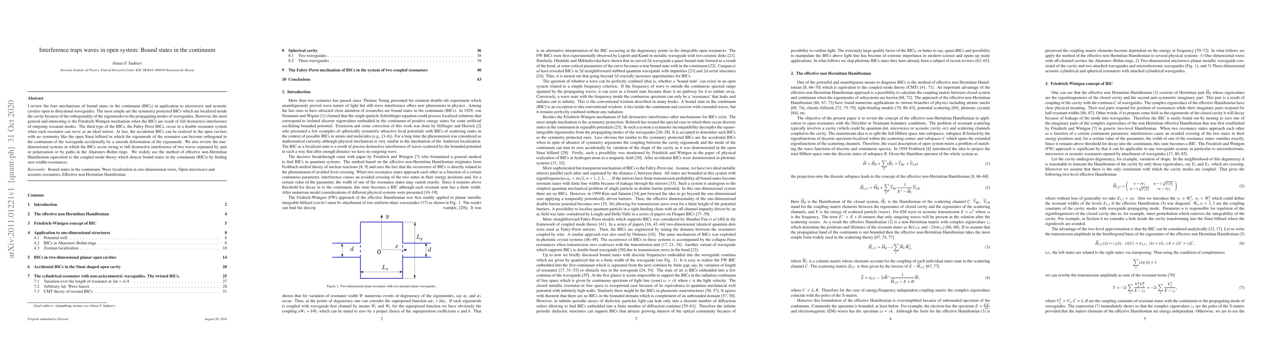 I review the four mechanisms of bound states in the continuum (BICs) in application to microwave and acoustic cavities open to directional waveguides. The most simple are the symmetry protected BICs which are localized inside the cavity because of the orthogonality of the eigenmodes to the propagating modes of waveguides. However, the most general and interesting is the Friedrich-Wintgen mechanism when the BICs are result of full destructive interference of outgoing resonant modes. The third type of the BICs, the Fabry-Perot BICs, occur in a double resonator system when each resonator can serve as an ideal mirror. At last, the accidental BICs can be realized in the open cavities with no symmetry like the open Sinai billiard in which the eigenmode of the resonator can become orthogonal to the continuum of the waveguide accidentally by a smooth deformation of the eigenmode. We also review the one-dimensional systems in which the BICs occur owing to full destructive interference of two waves separated by spin or polarization or by paths in the Aharonov-Bohm rings. We widely use the method of effective non-Hermitian Hamiltonian equivalent to the coupled mode theory which detects bound states in the continuum (BICs) by finding zero widths resonances.