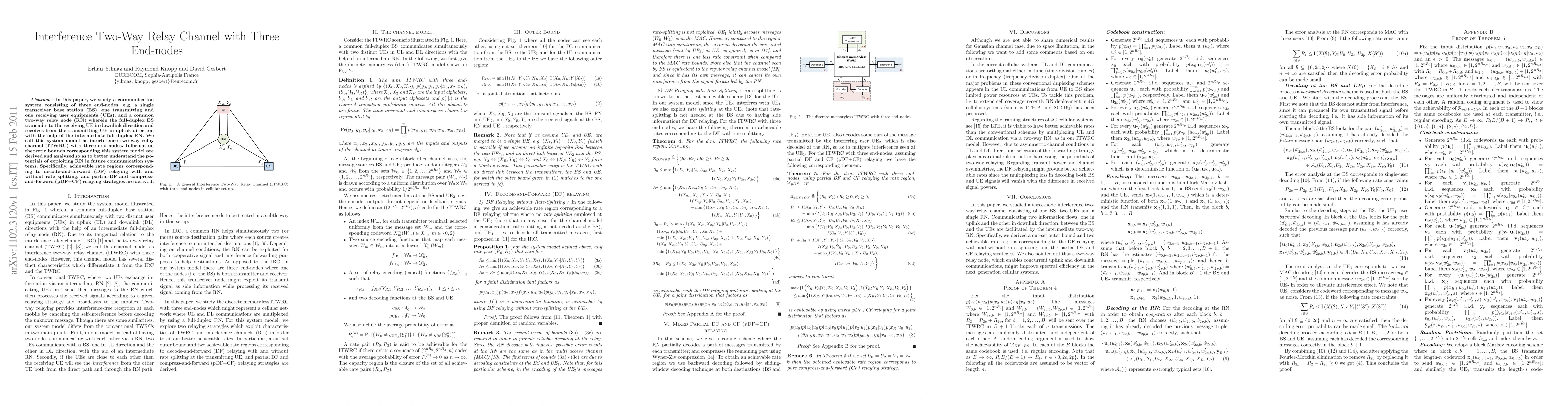 In this paper, we study a communication system consisting of three end-nodes, e.g. a single transceiver base station (BS), one transmitting and one receiving user equipments (UEs), and a common two-way relay node (RN) wherein the full-duplex BS transmits to the receiving UE in downlink direction and receives from the transmitting UE in uplink direction with the help of the intermediate full-duplex RN. We call this system model as interference two-way relay channel (ITWRC) with three end-nodes. Information theoretic bounds corresponding this system model are derived and analyzed so as to better understand the potentials of exploiting RN in future communication systems. Specifically, achievable rate regions corresponding to decode-and-forward (DF) relaying with and without rate splitting, and partial-DF and compress-and-forward (pDF+CF) relaying strategies are derived.