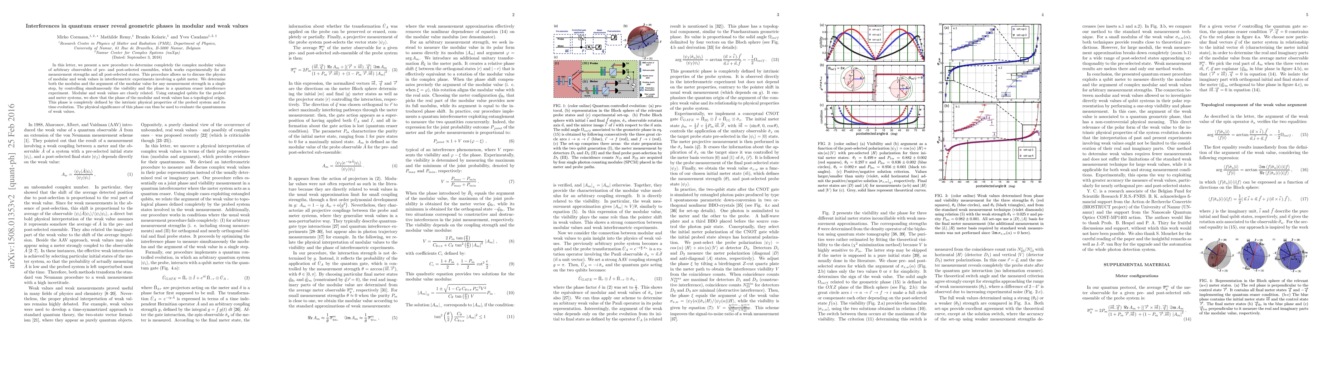 In this letter, we present a new procedure to determine completely the complex modular values of arbitrary observables of pre- and post-selected ensembles, which works experimentally for all measurement strengths and all post-selected states. This procedure allows us to discuss the physics of modular and weak values in interferometric experiments involving a qubit meter. We determine both the modulus and the argument of the modular value for any measurement strength in a single step, by controlling simultaneously the visibility and the phase in a quantum eraser interference experiment. Modular and weak values are closely related. Using entangled qubits for the probed and meter systems, we show that the phase of the modular and weak values has a topological origin. This phase is completely defined by the intrinsic physical properties of the probed system and its time evolution. The physical significance of this phase can thus be used to evaluate the quantumness of weak values.