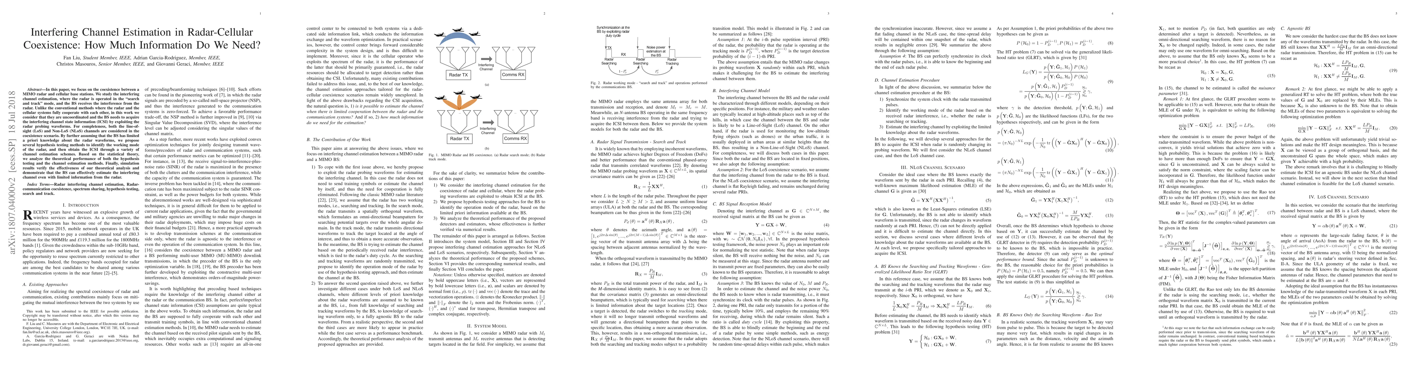 In this paper, we focus on the coexistence between a MIMO radar and cellular base stations. We study the interfering channel estimation, where the radar is operated in the "search and track" mode, and the BS receives the interference from the radar. Unlike the conventional methods where the radar and the cellular systems fully cooperate with each other, in this work we consider that they are uncoordinated and the BS needs to acquire the interfering channel state information (ICSI) by exploiting the radar probing waveforms. For completeness, both the line-of-sight (LoS) and Non-LoS (NLoS) channels are considered in the coexistence scenario. By further assuming that the BS has limited a priori knowledge about the radar waveforms, we propose several hypothesis testing methods to identify the working mode of the radar, and then obtain the ICSI through a variety of channel estimation schemes. Based on the statistical theory, we analyze the theoretical performance of both the hypothesis testing and the channel estimation methods. Finally, simulation results verify the effectiveness of our theoretical analysis and demonstrate that the BS can effectively estimate the interfering channel even with limited information from the radar.