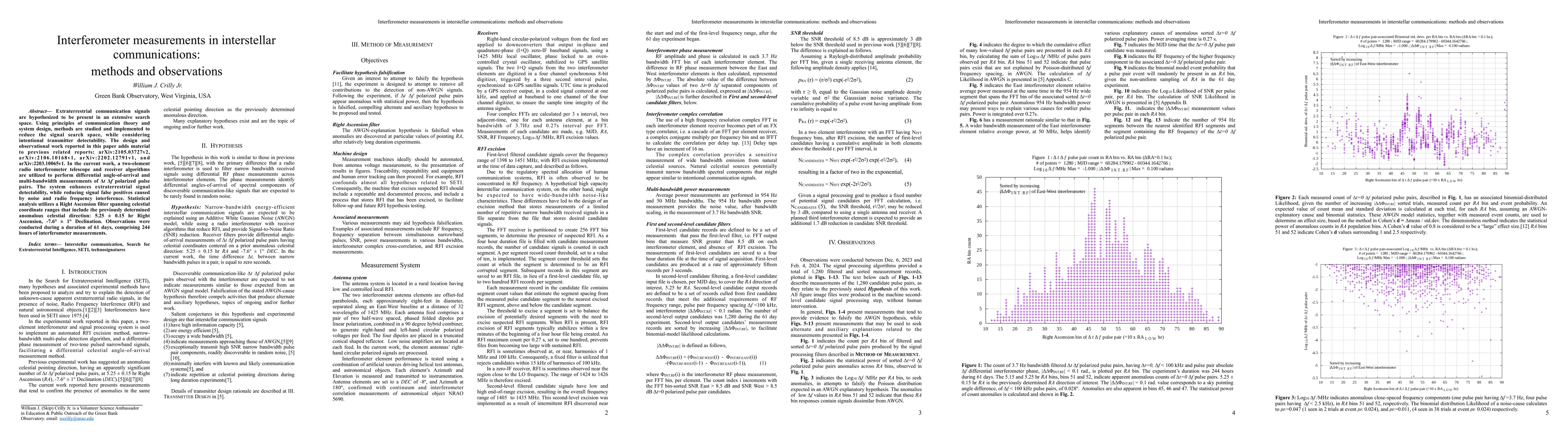 Extraterrestrial communication signals are hypothesized to be present in an extensive search space. Using principles of communication theory and system design, methods are studied and implemented to reduce the signal search space, while considering intentional transmitter detectability. The design and observational work reported in this paper adds material to previous related reports. (ref. arXiv:2105.03727, arXiv:2106.10168, arXiv:2202.12791, arXiv:2203.10065). In the current work, a two-element radio interferometer telescope and receiver algorithms are utilized to perform differential angle-of-arrival and multi-bandwidth measurements of delta-t delta-f polarized pulse pairs. The system enhances extraterrestrial signal detectability, while reducing signal false positives caused by noise and radio frequency interference. Statistical analysis utilizes a Right Ascension filter spanning celestial coordinate ranges that include the previously determined anomalous celestial direction: 5.25 +- 0.15 hr Right Ascension, -7.6 degrees +- 1 degree Declination. Observations were conducted during a duration of 61 days, comprising 244 hours of interferometer measurements.