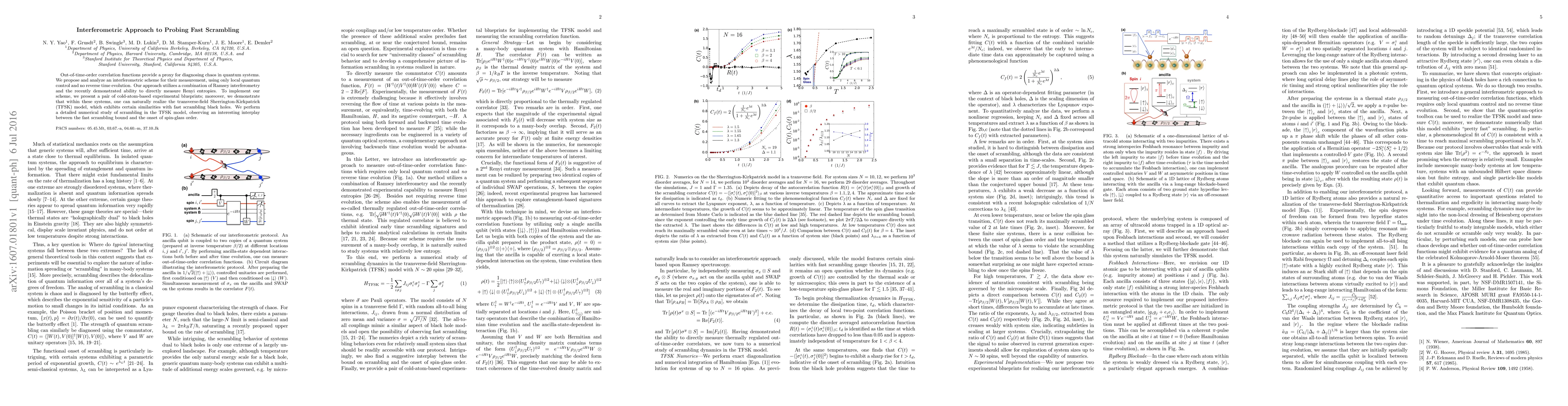This paper proposes an interferometric method for measuring out-of-time-order correlation functions to diagnose chaos in quantum systems without reverse time evolution, using Ramsey interferometry and Renyi entropies. The study demonstrates cold-atom experimental designs and analyzes the transverse-field Sherrington-Kirkpatrick model, highlighting its relation to fast scrambling black holes and the interplay between scrambling and spin-glass order.