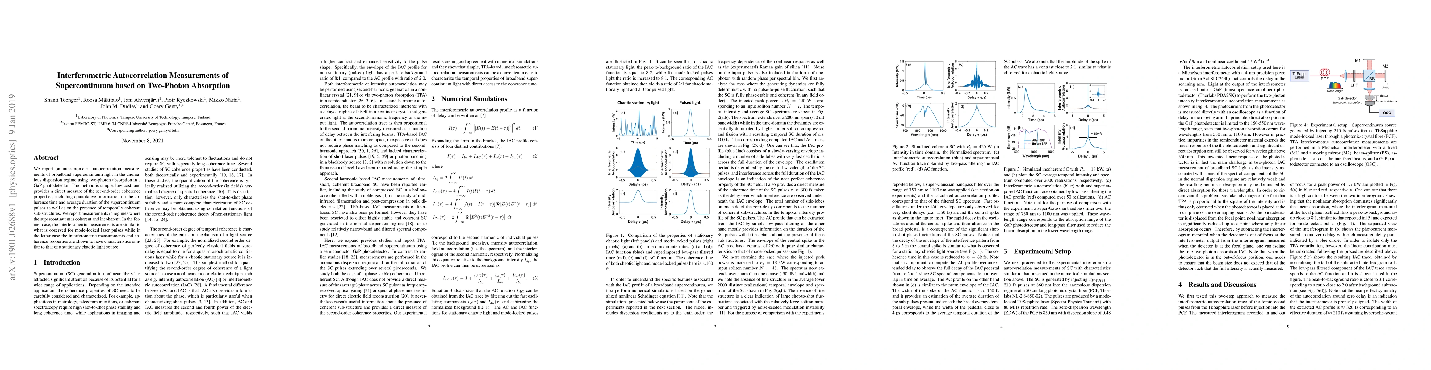 This paper presents interferometric autocorrelation measurements of broadband supercontinuum light using two-photon absorption in a GaP photodetector, providing a low-cost method to assess second-order coherence properties and temporal coherence. The study reveals distinct coherence characteristics in coherent versus incoherent supercontinuum regimes.