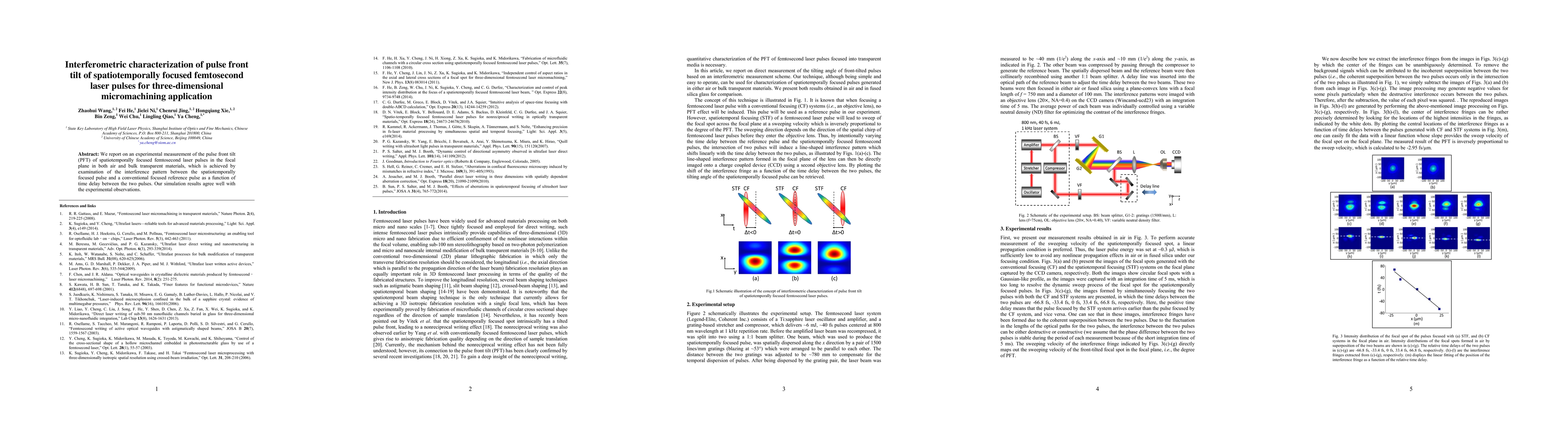 This paper presents an experimental method to measure pulse front tilt (PFT) of spatiotemporally focused femtosecond laser pulses using interferometry, and validates the findings with simulations that match the observed interference patterns.