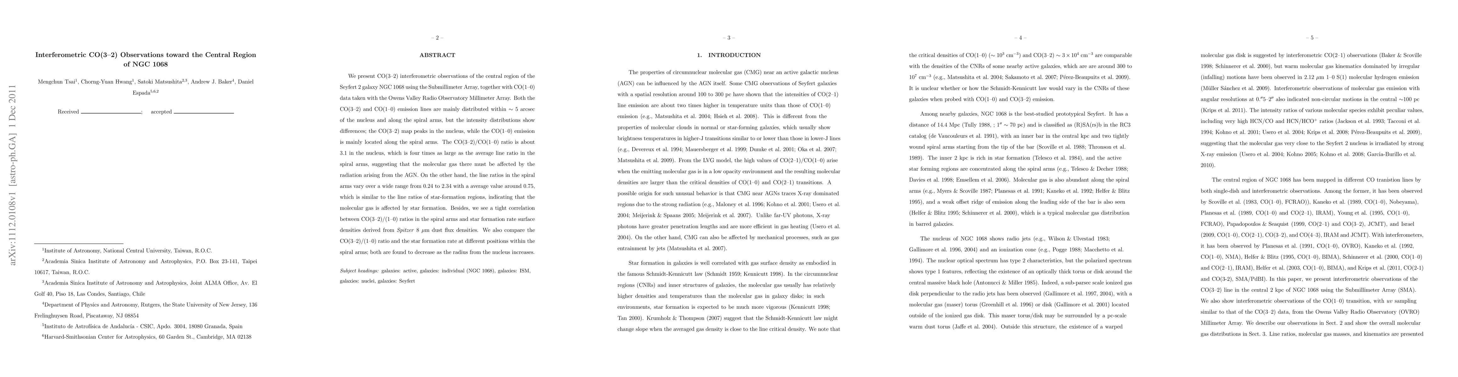 We present CO(3-2) interferometric observations of the central region of the Seyfert 2 galaxy NGC 1068 using the Submillimeter Array, together with CO(1-0) data taken with the Owens Valley Radio Observatory Millimeter Array. Both the CO(3-2) and CO(1-0) emission lines are mainly distributed within ~5 arcsec of the nucleus and along the spiral arms, but the intensity distributions show differences; the CO(3-2) map peaks in the nucleus, while the CO(1-0) emission is mainly located along the spiral arms. The CO(3-2)/CO(1-0) ratio is about 3.1 in the nucleus, which is four times as large as the average line ratio in the spiral arms, suggesting that the molecular gas there must be affected by the radiation arising from the AGN. On the other hand, the line ratios in the spiral arms vary over a wide range from 0.24 to 2.34 with a average value around 0.75, which is similar to the line ratios of star-formation regions, indicating that the molecular gas is affected by star formation. Besides, we see a tight correlation between CO(3-2)/(1-0) ratios in the spiral arms and star formation rate surface densities derived from Spitzer 8 {\mu}m dust flux densities. We also compare the CO(3-2)/(1-0) ratio and the star formation rate at different positions within the spiral arms; both are found to decrease as the radius from the nucleus increases.