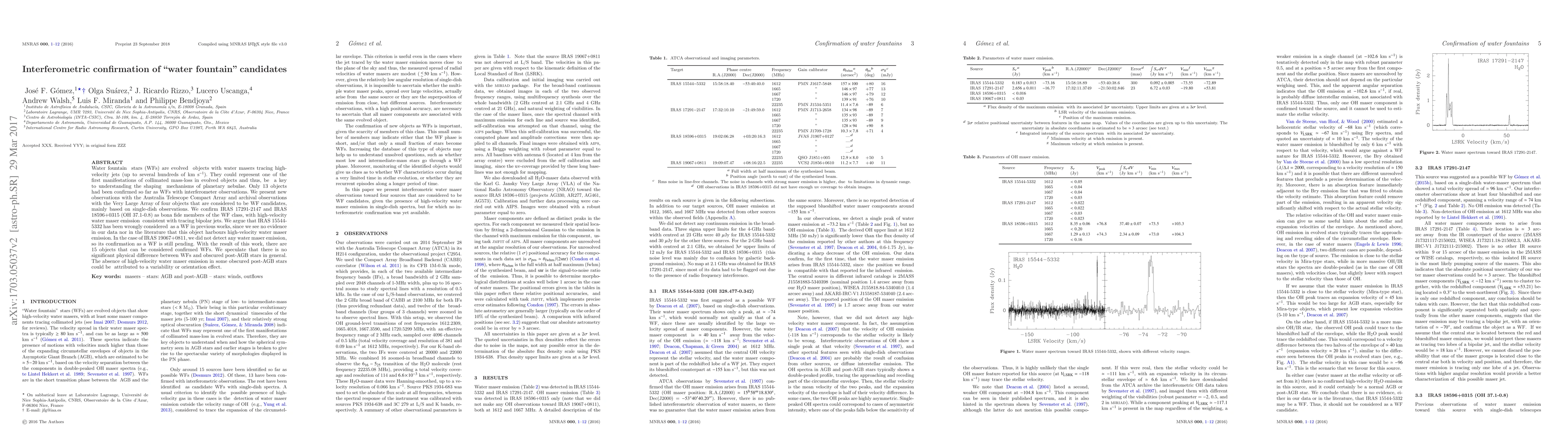 Water fountain stars (WFs) are evolved objects with water masers tracing high-velocity jets (up to several hundreds of km s$^{-1}$). They could represent one of the first manifestations of collimated mass-loss in evolved objects and thus, be a key to understanding the shaping mechanisms of planetary nebulae. Only 13 objects had been confirmed so far as WFs with interferometer observations. We present new observations with the Australia Telescope Compact Array and archival observations with the Very Large Array of four objects that are considered to be WF candidates, mainly based on single-dish observations. We confirm IRAS 17291-2147 and IRAS 18596+0315 (OH 37.1-0.8) as bona fide members of the WF class, with high-velocity water maser emission consistent with tracing bipolar jets. We argue that IRAS 15544-5332 has been wrongly considered as a WF in previous works, since we see no evidence in our data nor in the literature that this object harbours high-velocity water maser emission. In the case of IRAS 19067+0811, we did not detect any water maser emission, so its confirmation as a WF is still pending. With the result of this work, there are 15 objects that can be considered confirmed WFs. We speculate that there is no significant physical difference between WFs and obscured post-AGB stars in general. The absence of high-velocity water maser emission in some obscured post-AGB stars could be attributed to a variability or orientation effect.