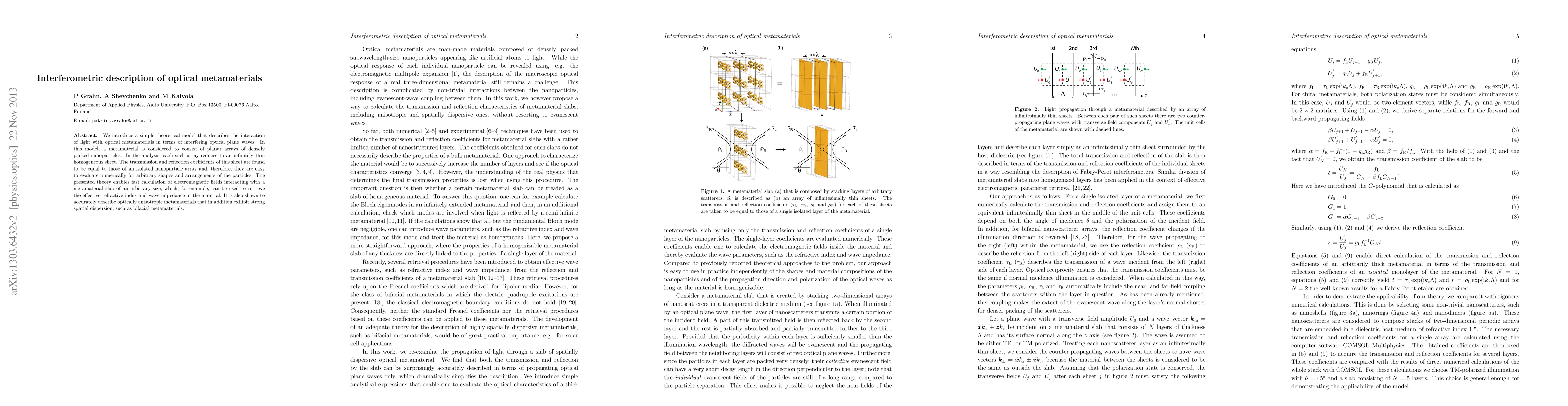 We introduce a simple theoretical model that describes the interaction of light with optical metamaterials in terms of interfering optical plane waves. In this model, a metamaterial is considered to consist of planar arrays of densely packed nanoparticles. In the analysis, each such array reduces to an infinitely thin homogeneous sheet. The transmission and reflection coefficients of this sheet are found to be equal to those of an isolated nanoparticle array and, therefore, they are easy to evaluate numerically for arbitrary shapes and arrangements of the particles. The presented theory enables fast calculation of electromagnetic fields interacting with a metamaterial slab of an arbitrary size, which, for example, can be used to retrieve the effective refractive index and wave impedance in the material. It is also shown to accurately describe optically anisotropic metamaterials that in addition exhibit strong spatial dispersion, such as bifacial metamaterials.