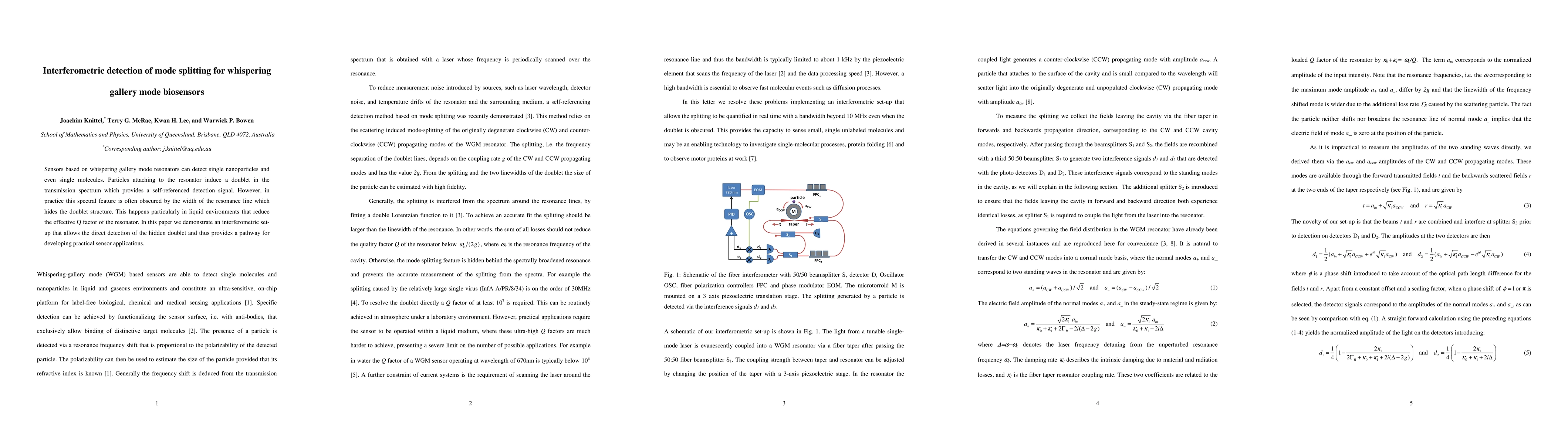 Sensors based on whispering gallery mode resonators can detect single nanoparticles and even single molecules. Particles attaching to the resonator induce a doublet in the transmission spectrum which provides a self-referenced detection signal. However, in practice this spectral feature is often obscured by the width of the resonance line which hides the doublet structure. This happens particularly in liquid environments that reduce the effective Q factor of the resonator. In this paper we demonstrate an interferometric set-up that allows the direct detection of the hidden doublet and thus provides a pathway for developing practical sensor applications.