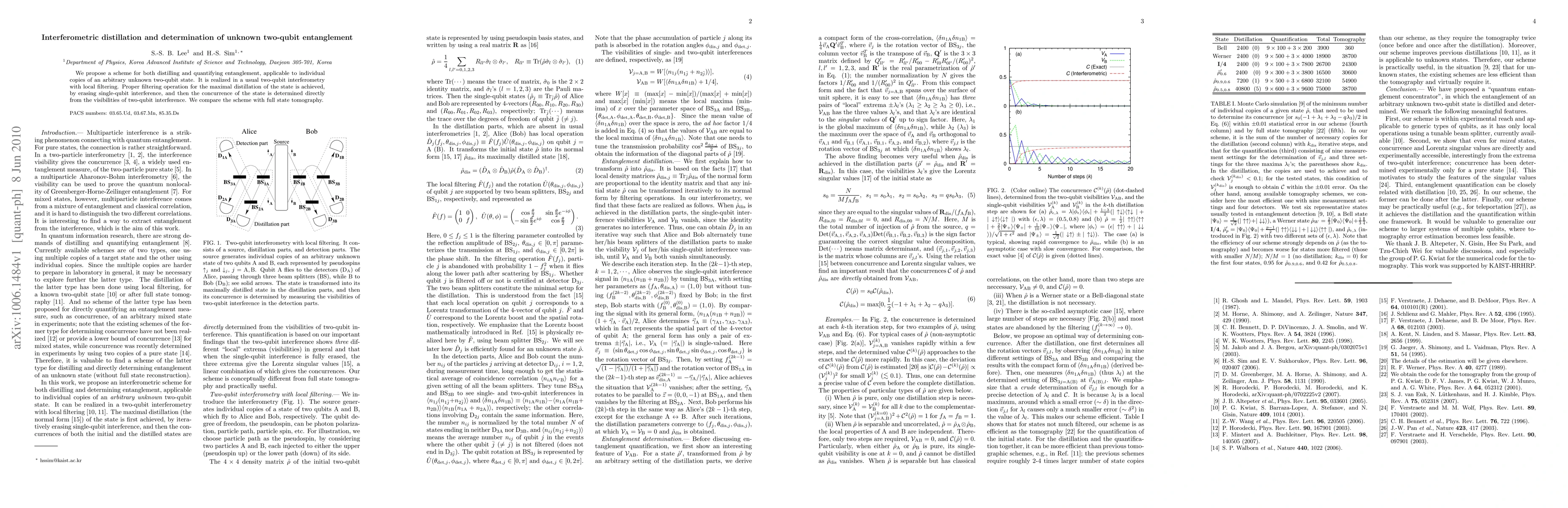 This paper proposes a method for distilling and quantifying entanglement in unknown two-qubit states using interferometry and local filtering, achieving maximal distillation by erasing single-qubit interference, and determining the state's concurrence from interference visibilities. The method is compared to full state tomography.