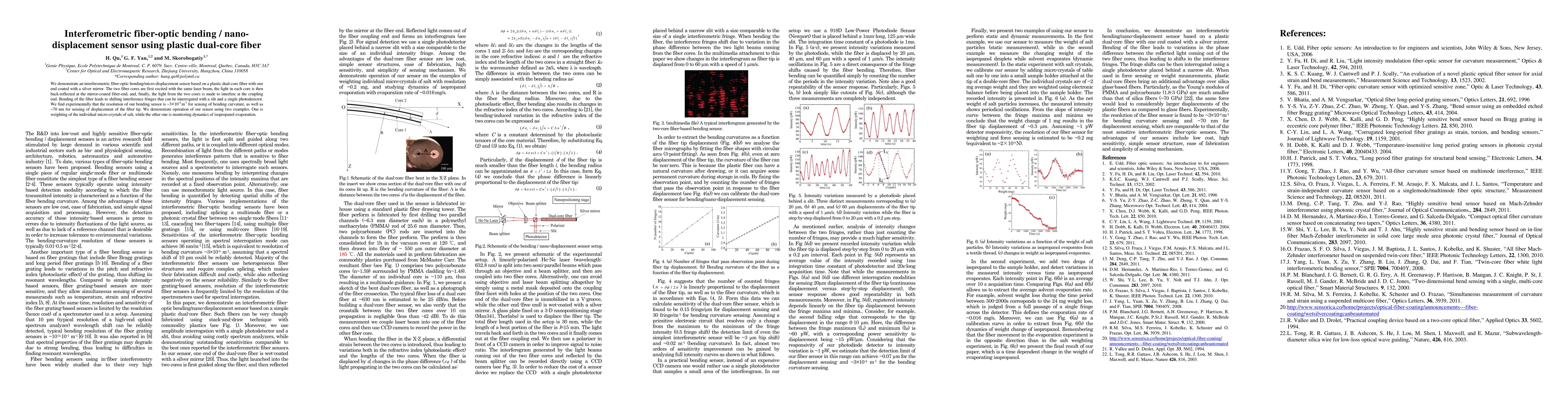 This paper presents an interferometric fiber-optic sensor using plastic dual-core fiber for bending and micro-displacement detection, achieving a resolution of ~3x10^-4 m^-1 for bending and ~70 nm for displacement, demonstrated through applications like micro-crystal weighing and isopropanol evaporation monitoring.