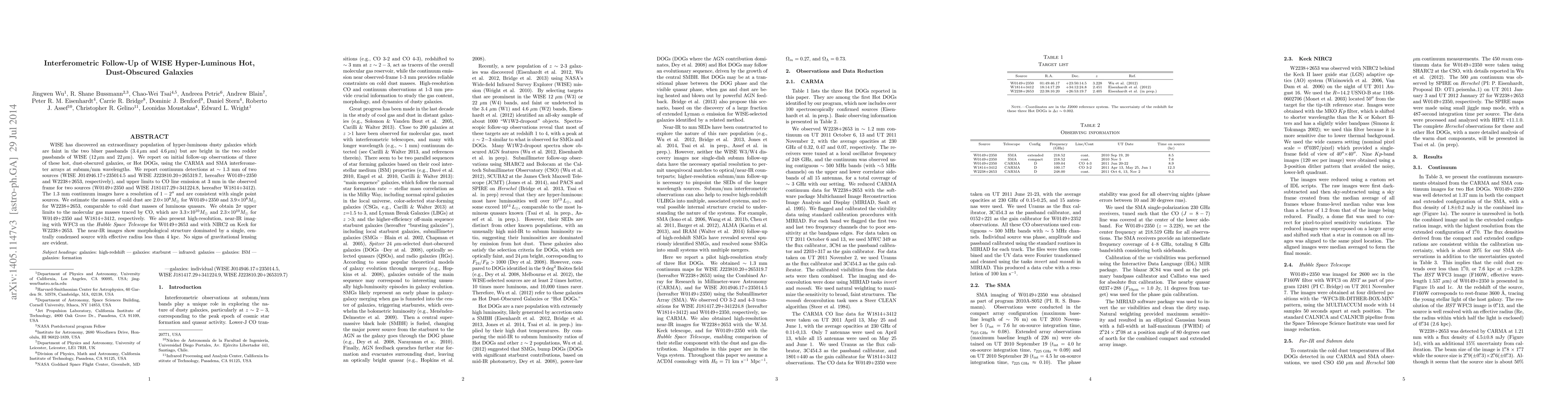 WISE has discovered an extraordinary population of hyper-luminous dusty galaxies which are faint in the two bluer passbands ($3.4\, \mu$m and $4.6\, \mu$m) but are bright in the two redder passbands of WISE ($12\, \mu$m and $22\, \mu$m). We report on initial follow-up observations of three of these hot, dust-obscured galaxies, or Hot DOGs, using the CARMA and SMA interferometer arrays at submm/mm wavelengths. We report continuum detections at $\sim$ 1.3 mm of two sources (WISE J014946.17+235014.5 and WISE J223810.20+265319.7, hereafter W0149+2350 and W2238+2653, respectively), and upper limits to CO line emission at 3 mm in the observed frame for two sources (W0149+2350 and WISE J181417.29+341224.8, hereafter W1814+3412). The 1.3 mm continuum images have a resolution of 1-2 arcsec and are consistent with single point sources. We estimate the masses of cold dust are 2.0$\times 10^{8} M_{\odot}$ for W0149+2350 and 3.9$\times 10^{8} M_{\odot}$ for W2238+2653, comparable to cold dust masses of luminous quasars. We obtain 2$\sigma$ upper limits to the molecular gas masses traced by CO, which are 3.3$\times 10^{10} M_{\odot}$ and 2.3$\times 10^{10} M_{\odot}$ for W0149+2350 and W1814+3412, respectively. We also present high-resolution, near-IR imaging with WFC3 on the Hubble Space Telescope for W0149+2653 and with NIRC2 on Keck for W2238+2653. The near-IR images show morphological structure dominated by a single, centrally condensed source with effective radius less than 4 kpc. No signs of gravitational lensing are evident.