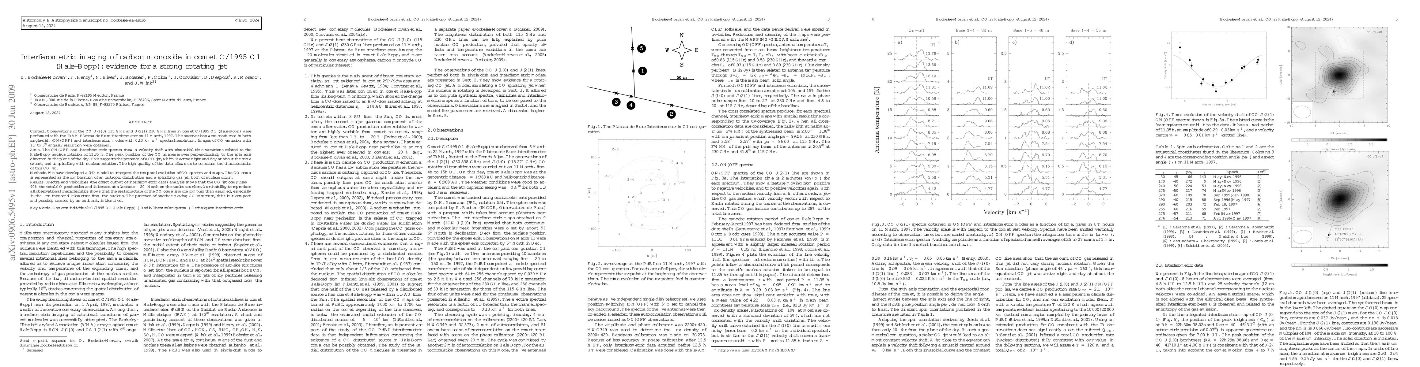 Observations of the CO J(1-0) 115 GHz and J(2-1) 230 GHz lines in comet C/1995 O1 (Hale-Bopp) were performed with the IRAM Plateau de Bure interferometer on 11 March, 1997. The observations were conducted in both single-dish (ON-OFF) and interferometric modes with 0.13 km s-1 spectral resolution. Images of CO emission with 1.7 to 3" angular resolution were obtained. The ON-OFF and interferometric spectra show a velocity shift with sinusoidal time variations related to the Hale-Bopp nucleus rotation of 11.35 h. The peak position of the CO images moves perpendicularly to the spin axis direction in the plane of the sky. This suggests the presence of a CO jet, which is active night and day at about the same extent, and is spiralling with nucleus rotation. The high quality of the data allows us to constrain the characteristics of this CO jet. We have developed a 3-D model to interpret the temporal evolution of CO spectra and maps. The CO coma is represented as the combination of an isotropic distribution and a spiralling gas jet, both of nucleus origin. Spectra and visibilities (the direct output of interferometric data) analysis shows that the CO jet comprises ~40% the total CO production and is located at a latitude ~20 degrees North on the nucleus surface. Our inability to reproduce all observational characteristics shows that the real structure of the CO coma is more complex than assumed, especially in the first thousand kilometres from the nucleus. The presence of another moving CO structure, faint but compact and possibly created by an outburst, is identified.