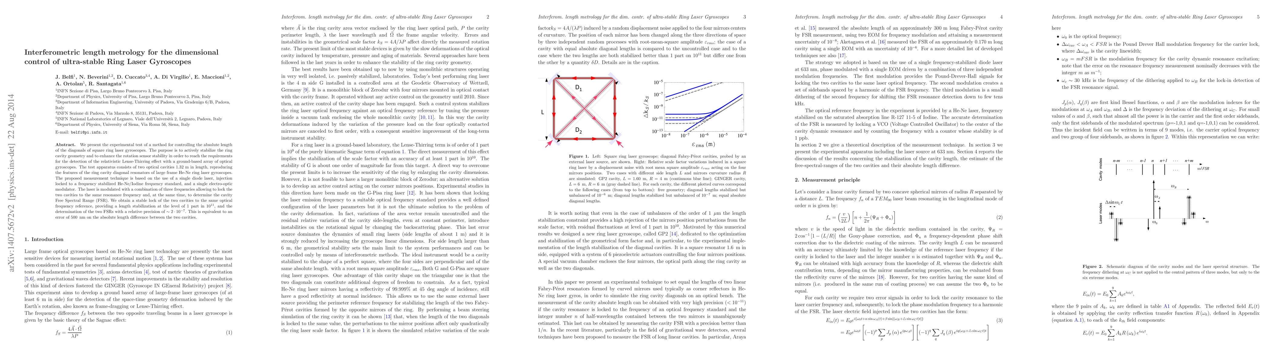 This paper details an experimental method for precisely controlling the length of ring laser gyroscopes to enhance their stability, crucial for detecting the relativistic Lense-Thirring effect. The technique uses interferometry and a single diode laser to stabilize the cavity geometry, achieving a length stabilization of 1 part in $10^{11}$ and a relative precision of 0.2 ppm.