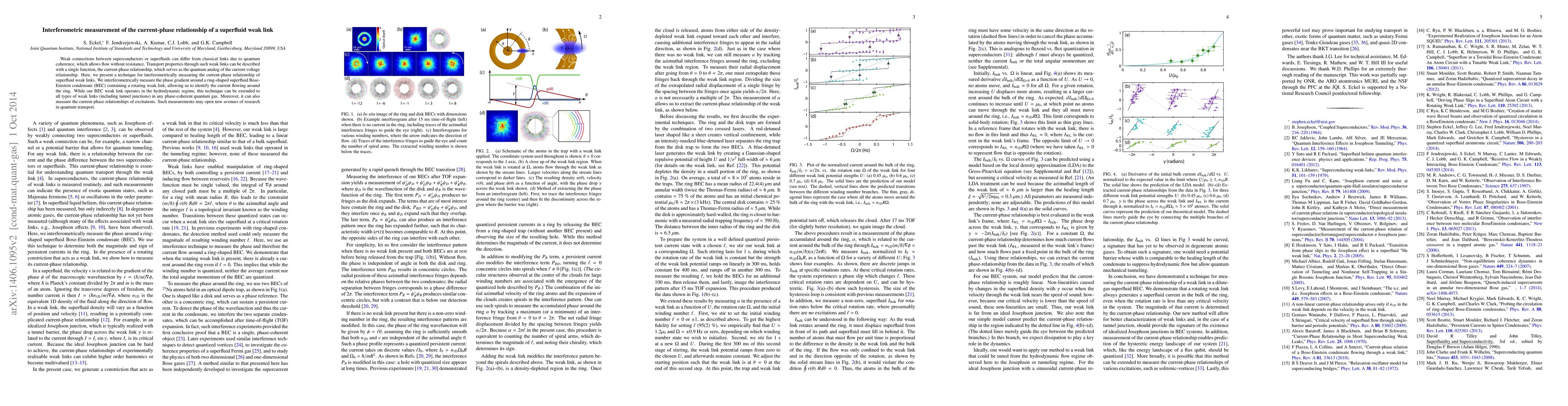 This paper presents an interferometric method to measure the current-phase relationship in superfluid weak links, demonstrating its application to a rotating Bose-Einstein condensate. The technique can be extended to various quantum systems, potentially advancing research in quantum transport.