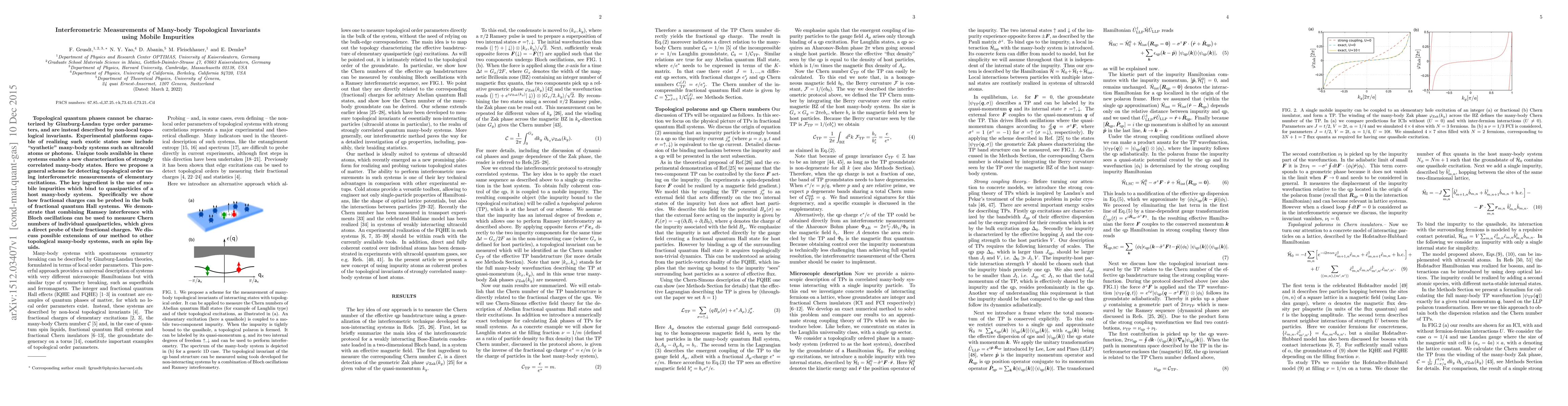 This paper proposes a method for detecting topological order in many-body systems using interferometric measurements of mobile impurities that bind to quasiparticles. The technique combines Ramsey interference and Bloch oscillations to measure Chern numbers, providing a direct probe of fractional charges in fractional quantum Hall systems.