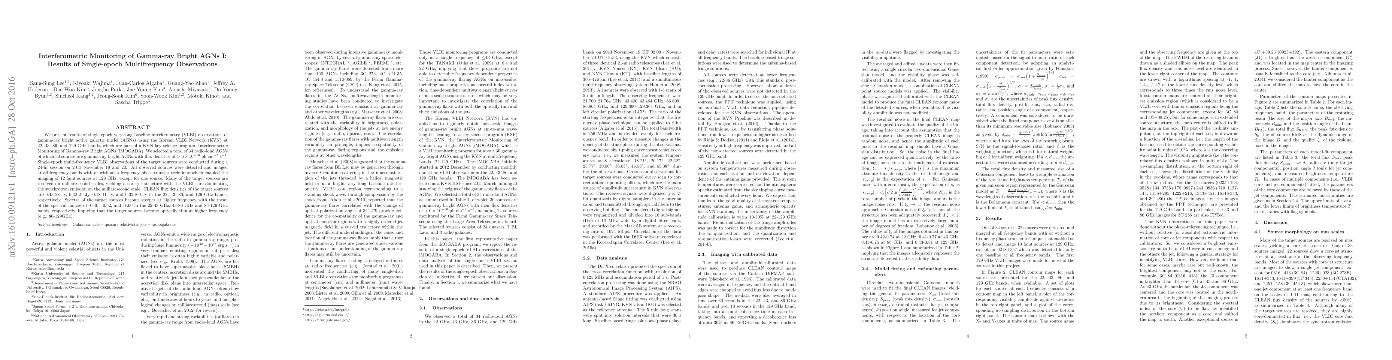 We present results of single-epoch very long baseline interferometry (VLBI) observations of gamma-ray bright active galactic nuclei (AGNs) using the Korean VLBI Network (KVN) at 22, 43, 86, and 129~GHz bands, which are part of a KVN key science program, Interferometric Monitoring of Gamma-ray Bright AGNs (iMOGABA). We selected a total of 34 radio-loud AGNs of which 30 sources are gamma-ray bright AGNs with flux densities of $>6\times10^{-10}$~ph~cm$^{-2}$~s$^{-1}$. Single-epoch multi-frequency VLBI observations of the target sources were conducted during a 24-hr session on 2013 November 19 and 20. All observed sources were detected and imaged at all frequency bands with or without a frequency phase transfer technique which enabled the imaging of 12 faint sources at 129~GHz, except for one source. Many of the target sources are resolved on milliarcsecond scales, yielding a core-jet structure with the VLBI core dominating the synchrotron emission on the milliarcsecond scale. CLEAN flux densities of the target sources are 0.43-28~Jy, 0.32-21~Jy, 0.18-11~Jy, and 0.35-8.0~Jy in the 22, 43, 86, and 129~GHz bands, respectively.