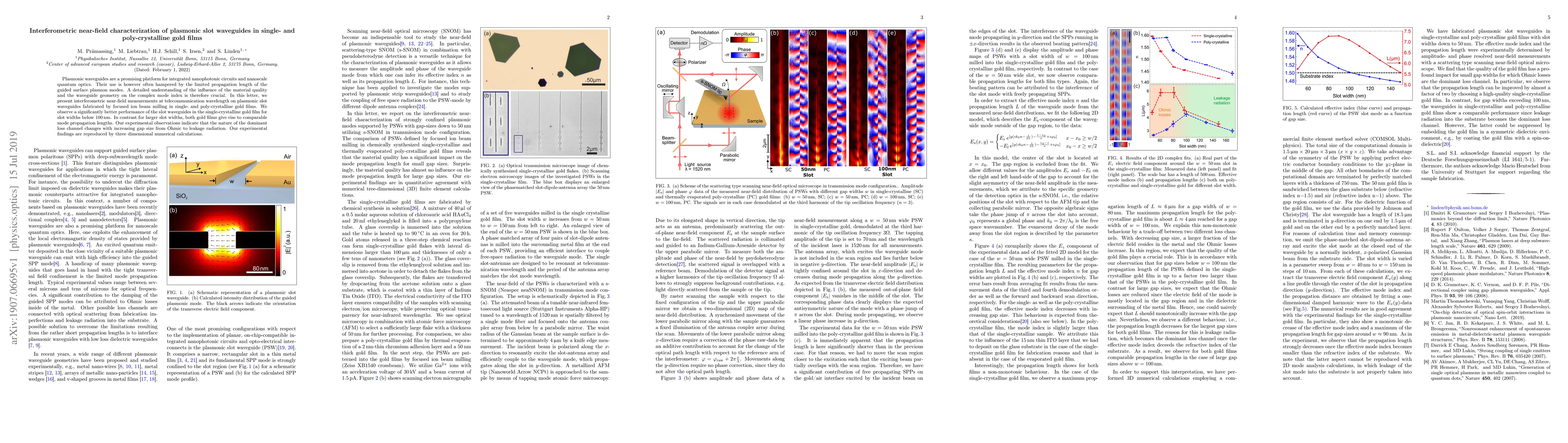 This paper presents interferometric near-field measurements of plasmonic slot waveguides in single- and poly-crystalline gold films, revealing better performance in single-crystalline gold for narrow slots and comparable performance for wider slots. The study highlights a shift from Ohmic to leakage radiation as the dominant loss mechanism with increasing slot width.