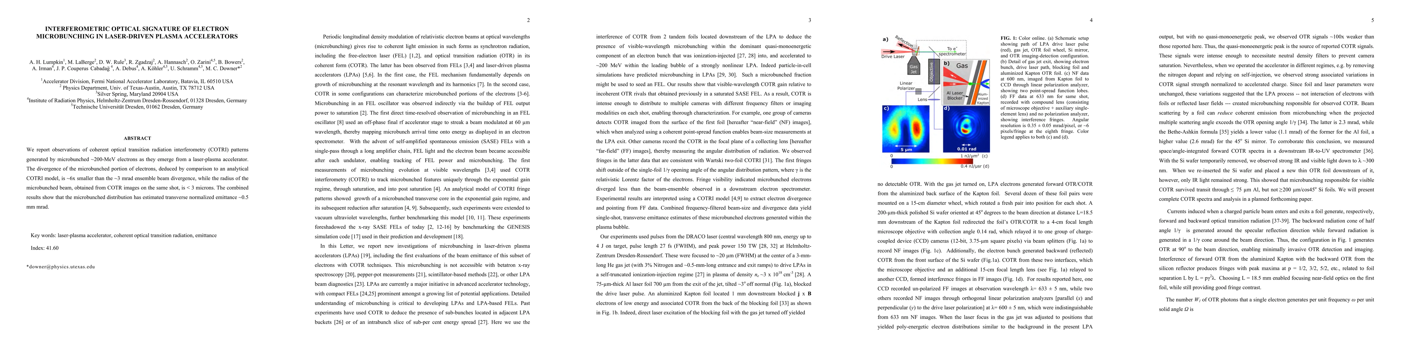 We report observations of coherent optical transition radiation interferometry (COTRI) patterns generated by microbunched ~200-MeV electrons as they emerge from a laser-plasma accelerator. The divergence of the microbunched portion of electrons, deduced by comparison to an analytical COTRI model, is ~6x smaller than the ~3 mrad ensemble beam divergence, while the radius of the microbunched beam, obtained from COTR images on the same shot, is < 3 microns. The combined results show that the microbunched distribution has estimated transverse normalized emittance ~0.5 mm mrad.