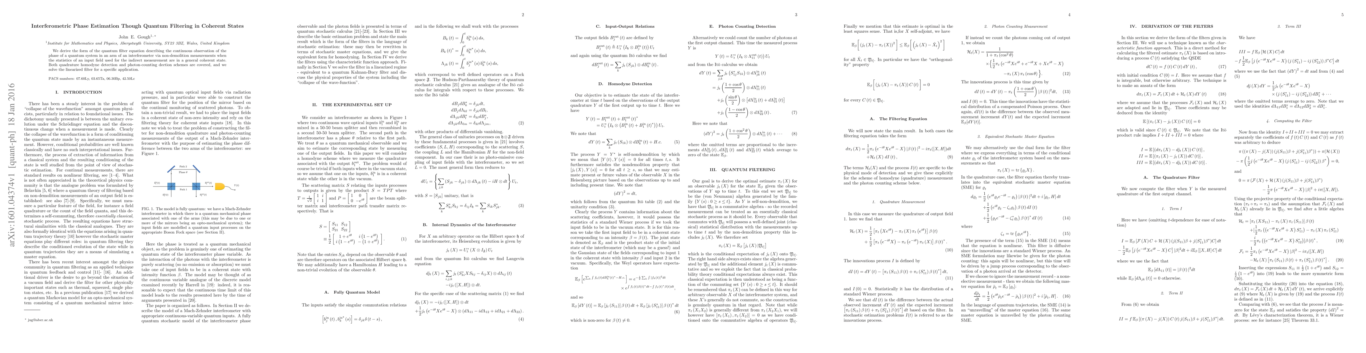 This paper derives the quantum filter equation for continuous phase estimation in an interferometer using non-demolition measurements on coherent states. It covers both homodyne and photon-counting detection schemes and solves the linearized filter for a specific application.