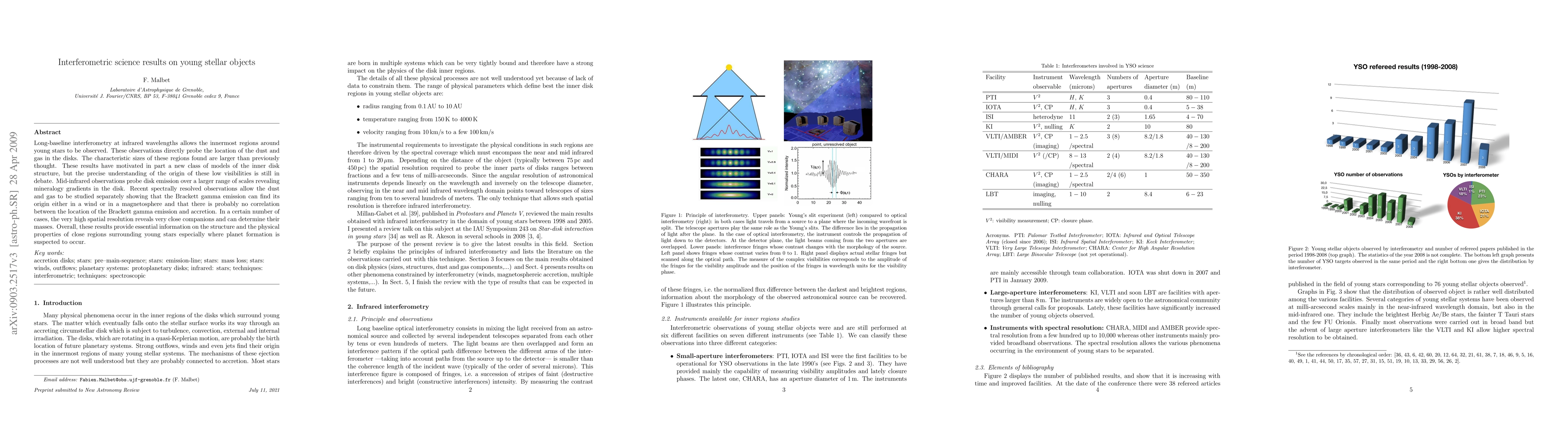 Long-baseline interferometry at infrared wavelengths allows the innermost regions around young stars to be observed. These observations directly probe the location of the dust and gas in the disks. The characteristic sizes of these regions found are larger than previously thought. These results have motivated in part a new class of models of the inner disk structure, but the precise understanding of the origin of these low visibilities is still in debate. Mid-infrared observations probe disk emission over a larger range of scales revealing mineralogy gradients in the disk. Recent spectrally resolved observations allow the dust and gas to be studied separately showing that the Brackett gamma emission can find its origin either in a wind or in a magnetosphere and that there is probably no correlation between the location of the Brackett gamma emission and accretion. In a certain number of cases, the very high spatial resolution reveals very close companions and can determine their masses. Overall, these results provide essential information on the structure and the physical properties of close regions surrounding young stars especially where planet formation is suspected to occur.