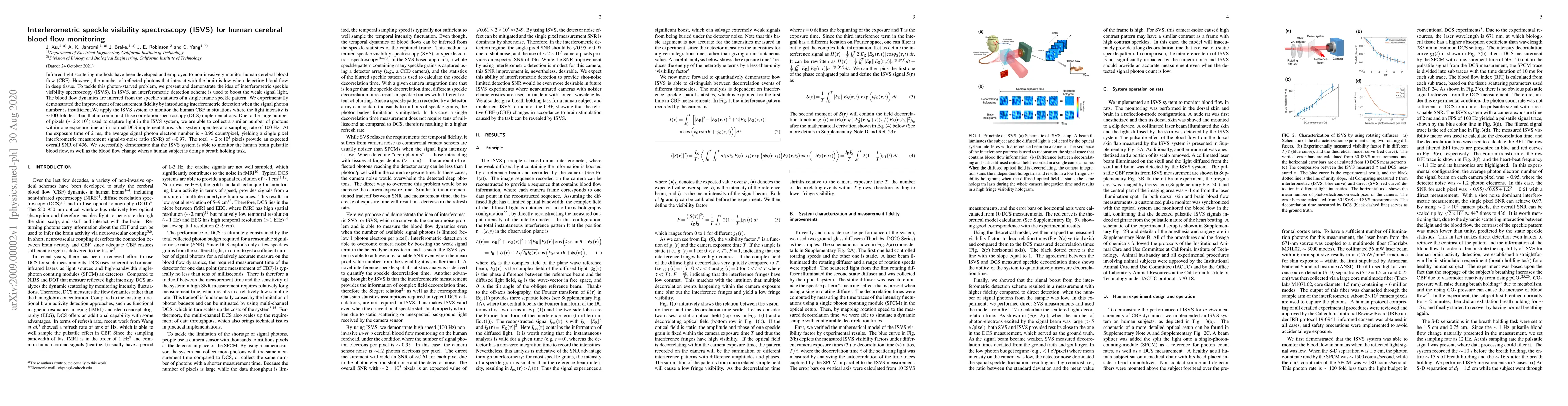 Infrared light scattering methods have been developed and employed to non-invasively monitor human cerebral blood flow (CBF). However, the number of reflected photons that interact with the brain is low when detecting blood flow in deep tissue. To tackle this photon-starved problem, we present and demonstrate the idea of interferometric speckle visibility spectroscopy (ISVS). In ISVS, an interferometric detection scheme is used to boost the weak signal light. The blood flow dynamics are inferred from the speckle statistics of a single frame speckle pattern. We experimentally demonstrated the improvement of measurement fidelity by introducing interferometric detection when the signal photon number is insufficient. We apply the ISVS system to monitor the human CBF in situations where the light intensity is $\sim$100-fold less than that in common diffuse correlation spectroscopy (DCS) implementations. Due to the large number of pixels ($\sim 2\times 10^5$) used to capture light in the ISVS system, we are able to collect a similar number of photons within one exposure time as in normal DCS implementations. Our system operates at a sampling rate of 100 Hz. At the exposure time of 2 ms, the average signal photon electron number is $\sim$0.95 count/pixel, yielding a single pixel interferometric measurement signal-to-noise ratio (SNR) of $\sim$0.97. The total $\sim 2\times 10^5$ pixels provide an expected overall SNR of 436. We successfully demonstrate that the ISVS system is able to monitor the human brain pulsatile blood flow, as well as the blood flow change when a human subject is doing a breath holding task.