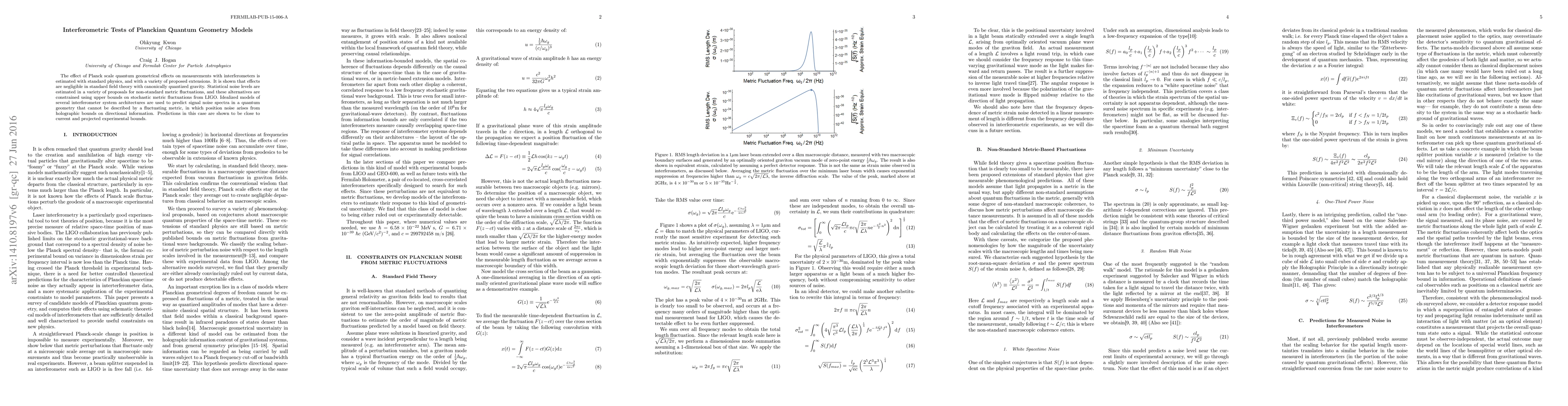The effect of Planck scale quantum geometrical effects on measurements with interferometers is estimated with standard physics, and with a variety of proposed extensions. It is shown that effects are negligible in standard field theory with canonically quantized gravity. Statistical noise levels are estimated in a variety of proposals for non-standard metric fluctuations, and these alternatives are constrained using upper bounds on stochastic metric fluctuations from LIGO. Idealized models of several interferometer system architectures are used to predict signal noise spectra in a quantum geometry that cannot be described by a fluctuating metric, in which position noise arises from holographic bounds on directional information. Predictions in this case are shown to be close to current and projected experimental bounds.