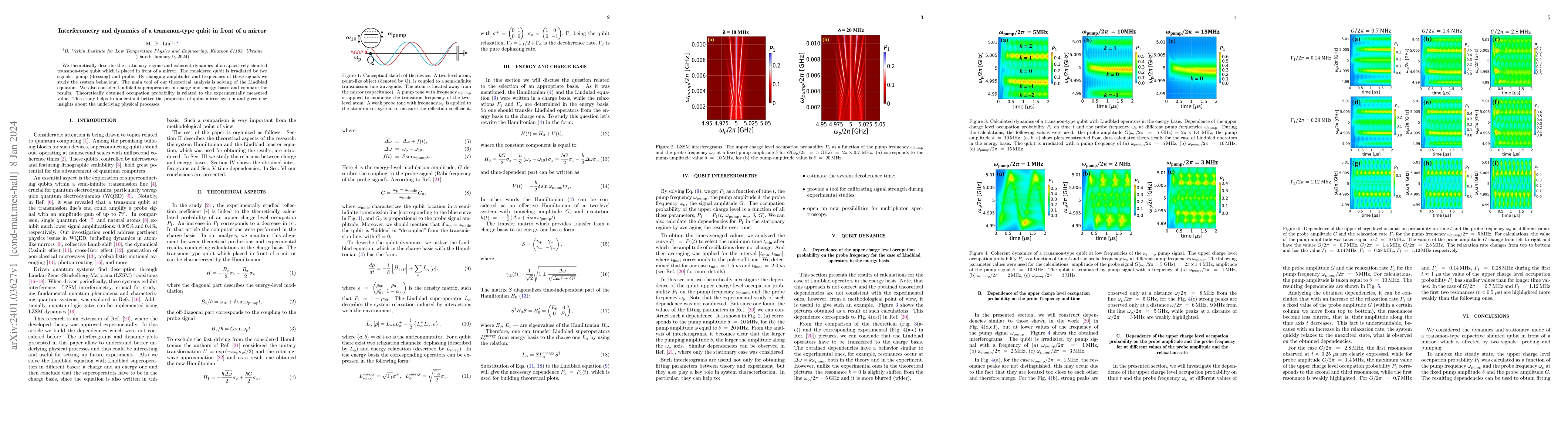 This paper explores the dynamics of a transmon-type qubit in front of a mirror under the influence of pump and probe signals, using the Lindblad equation to analyze the system's behavior. The study provides insights into the qubit-mirror interaction and validates theoretical results with experimental measurements.