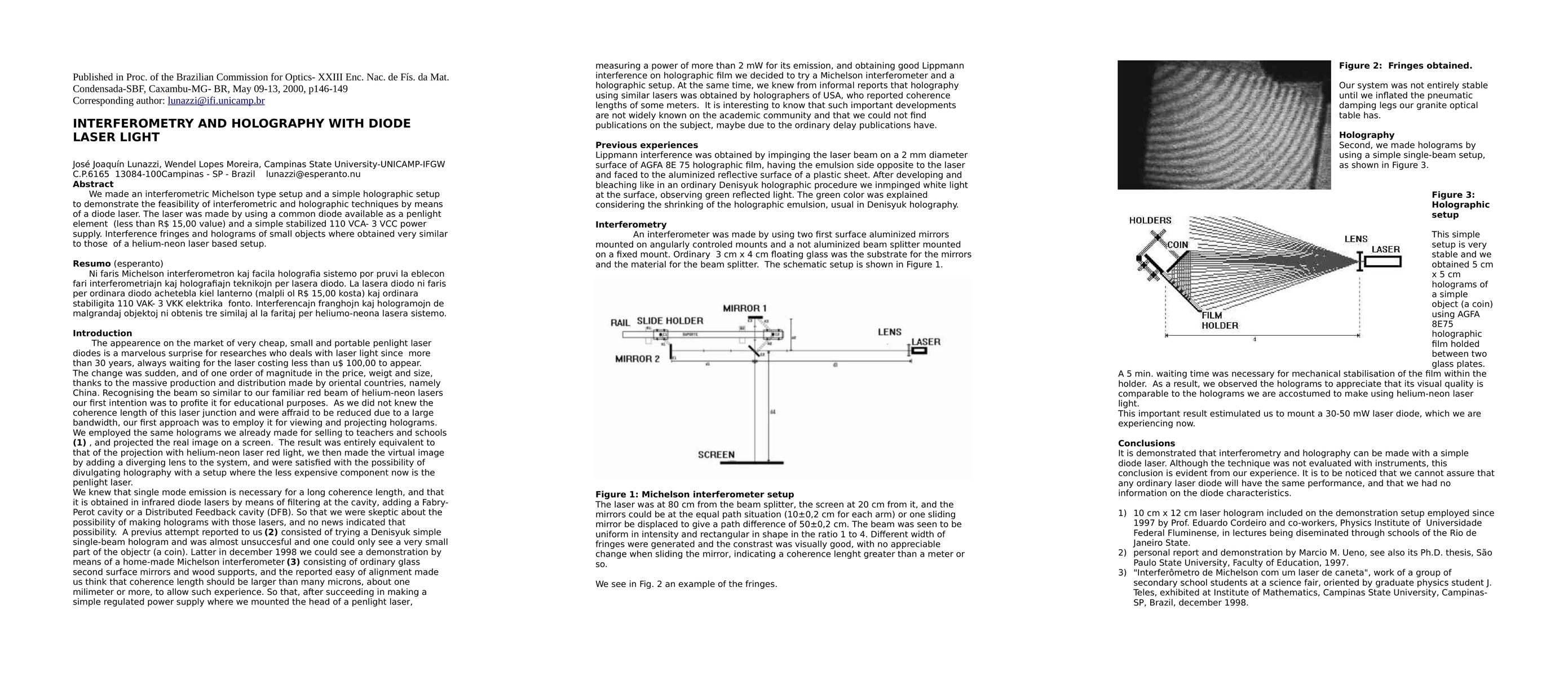 We made an interferometric Michelson type setup and a simple holographic setup to demonstrate the feasibility of interferometric and holographic techniques by means of a diode laser. The laser was made by using a common diode available as a penlight element (less than R$ 15,00 value) and a simple stabilized 110 VCA- 3 VCC power supply. Interference fringes and holograms of small objects where obtained very similar to those of a helium-neon laser based setup.