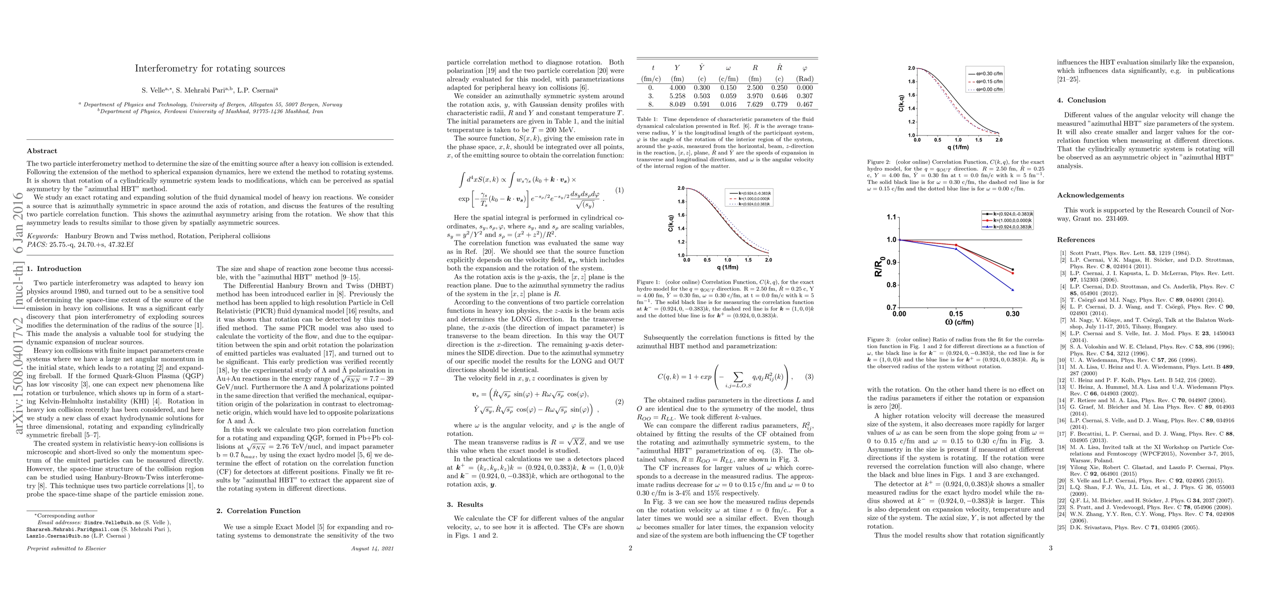The two particle interferometry method to determine the size of the emitting source after a heavy ion collision is extended. Following the extension of the method to spherical expansion dynamics, here we extend the method to rotating systems. It is shown that rotation of a cylindrically symmetric system leads to modifications, which can be perceived as spatial asymmetry by the "azimuthal HBT" method. We study an exact rotating and expanding solution of the fluid dynamical model of heavy ion reactions. We consider a source that is azimuthally symmetric in space around the axis of rotation, and discuss the features of the resulting two particle correlation function. This shows the azimuthal asymmetry arising from the rotation. We show that this asymmetry leads to results similar to those given by spatially asymmetric sources.