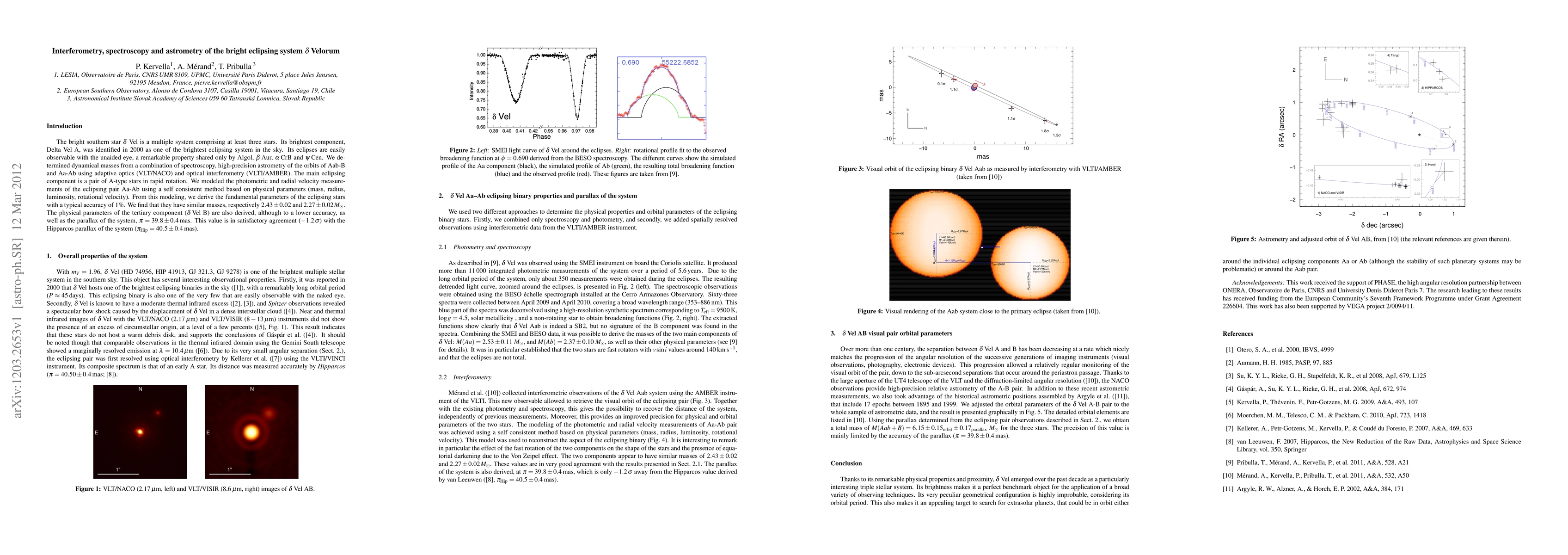 The bright southern star Delta Vel is a multiple system comprising at least three stars. Its brightest component, Delta Vel A, was identified in 2000 as one of the brightest eclipsing system in the sky. Its eclipses are easily observable with the unaided eye, a remarkable property shared only by Algol, Beta Aur, Alpha CrB and Psi Cen. We determined dynamical masses from a combination of spectroscopy, high-precision astrometry of the orbits of Aab-B and Aa-Ab using adaptive optics (VLT/NACO) and optical interferometry (VLTI/AMBER). The main eclipsing component is a pair of A-type stars in rapid rotation. We modeled the photometric and radial velocity measurements of the eclipsing pair Aa-Ab using a self consistent method based on physical parameters (mass, radius, luminosity, rotational velocity). From this modeling, we derive the fundamental parameters of the eclipsing stars with a typical accuracy of 1%. We find that they have similar masses, respectively 2.43 +/- 0.02 and 2.27 +/- 0.02 Msun. The physical parameters of the tertiary component (Delta Vel B) are also derived, although to a lower accuracy, as well as the parallax of the system, 39.8 +/- 0.4 mas. This value is in satisfactory agreement (-1.2 sigma) with the Hipparcos parallax of the system (pi_Hip =40.5 +/- 0.4 mas).