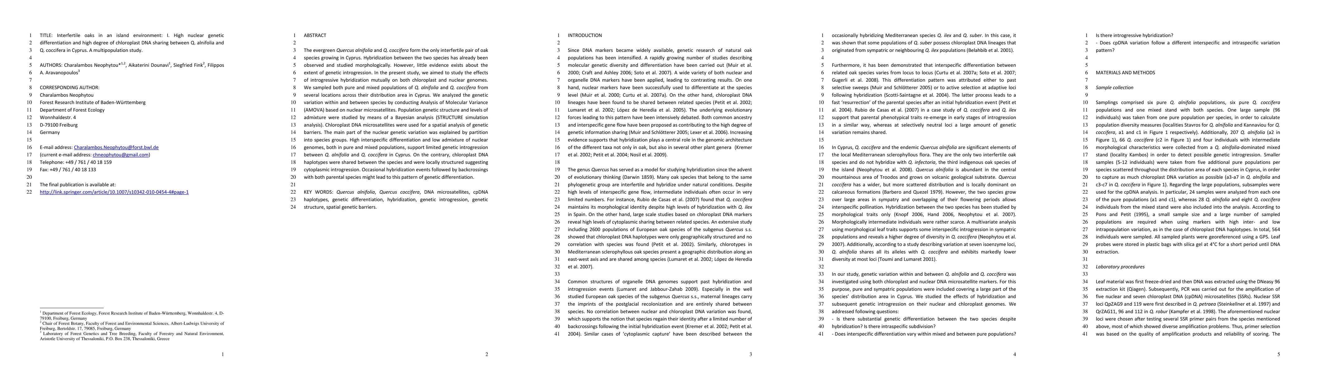 The evergreen Quercus alnifolia and Q. coccifera form the only interfertile pair of oak species growing in Cyprus. Hybridization between the two species has already been observed and studied morphologically. However, little evidence exists about the extent of genetic introgression. In the present study, we aimed to study the effects of introgressive hybridization mutually on both chloroplast and nuclear genomes. We sampled both pure and mixed populations of Q. alnifolia and Q. coccifera from several locations across their distribution area in Cyprus. We analyzed the genetic variation within and between species by conducting Analysis of Molecular Variance (AMOVA) based on nuclear microsatellites. Population genetic structure and levels of admixture were studied by means of a Bayesian analysis (STRUCTURE simulation analysis). Chloroplast DNA microsatellites were used for a spatial analysis of genetic barriers. The main part of the nuclear genetic variation was explained by partition into species groups. High interspecific differentiation and low admixture of nuclear genomes, both in pure and mixed populations, support limited genetic introgression between Q. alnifolia and Q. coccifera in Cyprus. On the contrary, chloroplast DNA haplotypes were shared between the species and were locally structured suggesting cytoplasmic introgression. Occasional hybridization events followed by backcrossings with both parental species might lead to this pattern of genetic differentiation.