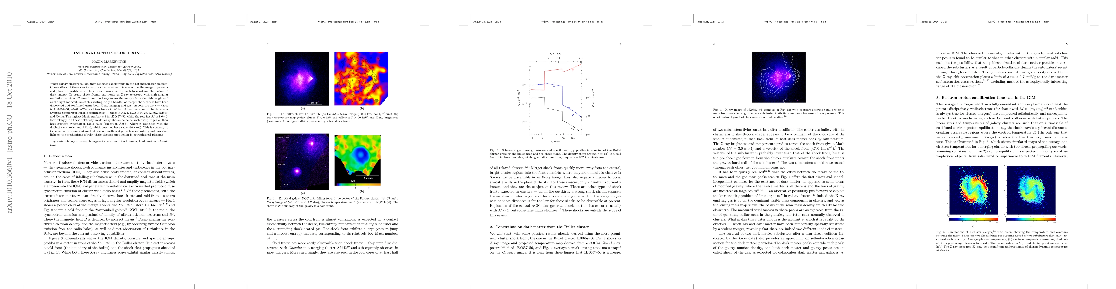 When galaxy clusters collide, they generate shock fronts in the hot intracluster medium. Observations of these shocks can provide valuable information on the merger dynamics and physical conditions in the cluster plasma, and even help constrain the nature of dark matter. To study shock fronts, one needs an X-ray telescope with high angular resolution (such as Chandra), and be lucky to see the merger from the right angle and at the right moment. As of this writing, only a handful of merger shock fronts have been discovered and confirmed using both X-ray imaging and gas temperature data -- those in 1E0657-56, A520, A754, and two fronts in A2146. A few more are probable shocks awaiting temperature profile confirmation -- those in A521, RXJ1314-25, A3667, A2744, and Coma. The highest Mach number is 3 in 1E0657-56, while the rest has M=1.6-2. Interestingly, all these relatively weak X-ray shocks coincide with sharp edges in their host cluster's synchrotron radio halos (except in A3667, where it coincides with the distinct radio relic, and A2146, which does not have radio data yet). This is contrary to the common wisdom that weak shocks are inefficient particle accelerators, and may shed light on the mechanisms of relativistic electron production in astrophysical plasmas.