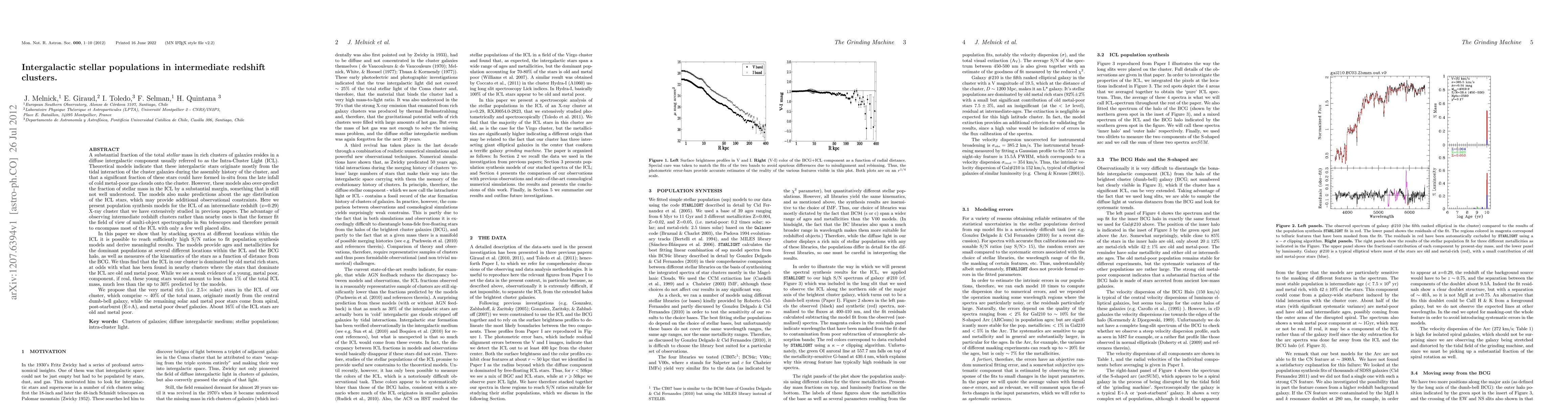 A substantial fraction of the total stellar mass in rich clusters of galaxies resides in a diffuse intergalactic component usually referred to as the Intra-Cluster Light (ICL). Theoretical models indicate that these intergalactic stars originate mostly from the tidal interaction of the cluster galaxies during the assembly history of the cluster, and that a significant fraction of these stars could have formed in-situ from the late infall of cold metal-poor gas clouds onto the cluster. The models make predictions about the age distribution of the ICL stars, which may provide additional observational constraints. However, these models also over-predict the fraction of stellar mass in the ICL by a substantial margin. Here we present population synthesis models for the ICL of a dumb-bell dominated intermediate redshift (z=0.29) X-ray cluster for which we have deep MOS data obtained with the FORS2 instrument. In a previous paper we have proposed that the dumbell galaxy act as a grinding machine tearing to pieces the galaxies that pass nearby thus enriching the intergalactic medium. In this paper we analyze the spectra at different locations within the ICL and find that it is dominated by old metal rich stars, at odds with what has been found in nearby clusters where the stars that dominate the ICL are old and metal poor. While we see a weak evidence of a young, metal poor, component, if real, these young stars would amount to less than 1% of the total ICL mass, much less than the up to 30% predicted by the models. We propose that the very metal rich (i.e. 2.5 times solar) stars in the ICL of our cluster, which comprise approximately 40% of the total mass, originate mostly from the central dumb-bell galaxy, while the remaining solar and metal poor stars come from spiral, post-starburst (E+A), and metal poor dwarf galaxies. About 16% of the ICL stars are old and metal poor.