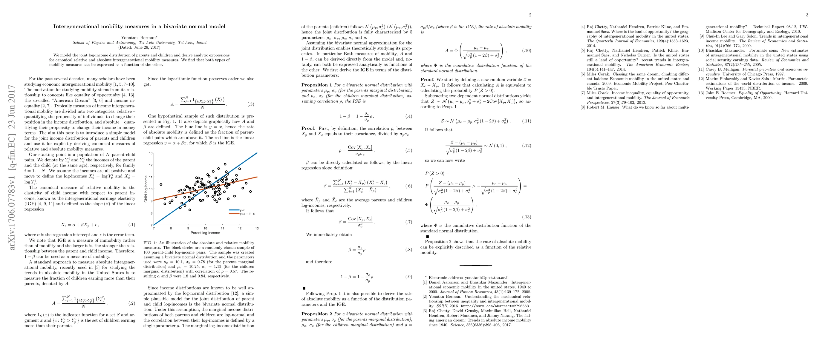 This paper models the joint log-income distribution of parents and children using a bivariate normal framework, deriving analytic expressions for relative and absolute intergenerational mobility measures. It demonstrates that these measures can be expressed as functions of each other.