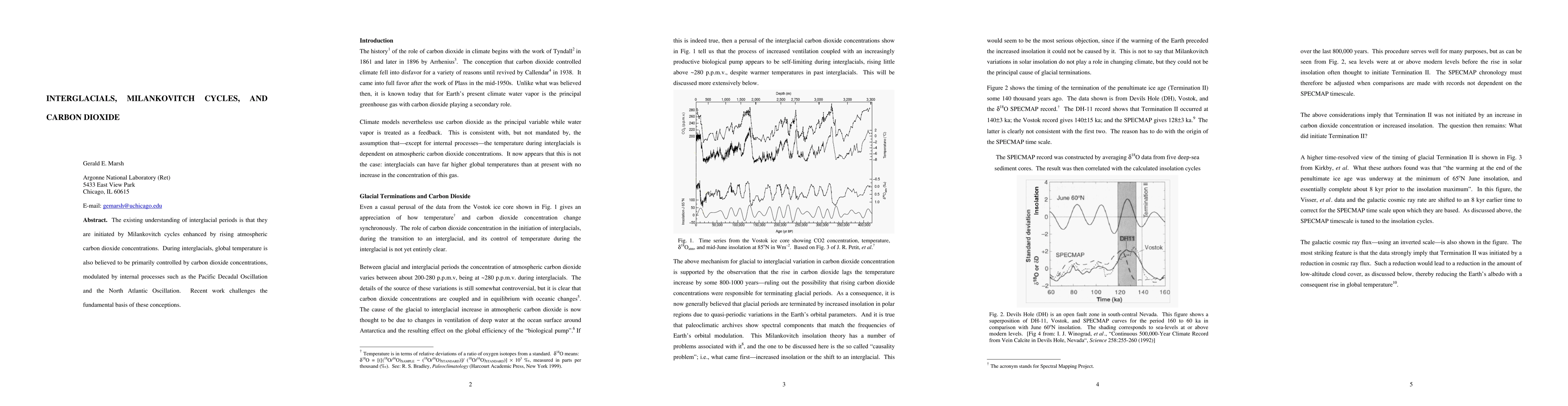 The existing understanding of interglacial periods is that they are initiated by Milankovitch cycles enhanced by rising atmospheric carbon dioxide concentrations. During interglacials, global temperature is also believed to be primarily controlled by carbon dioxide concentrations, modulated by internal processes such as the Pacific Decadal Oscillation and the North Atlantic Oscillation. Recent work challenges the fundamental basis of these conceptions.