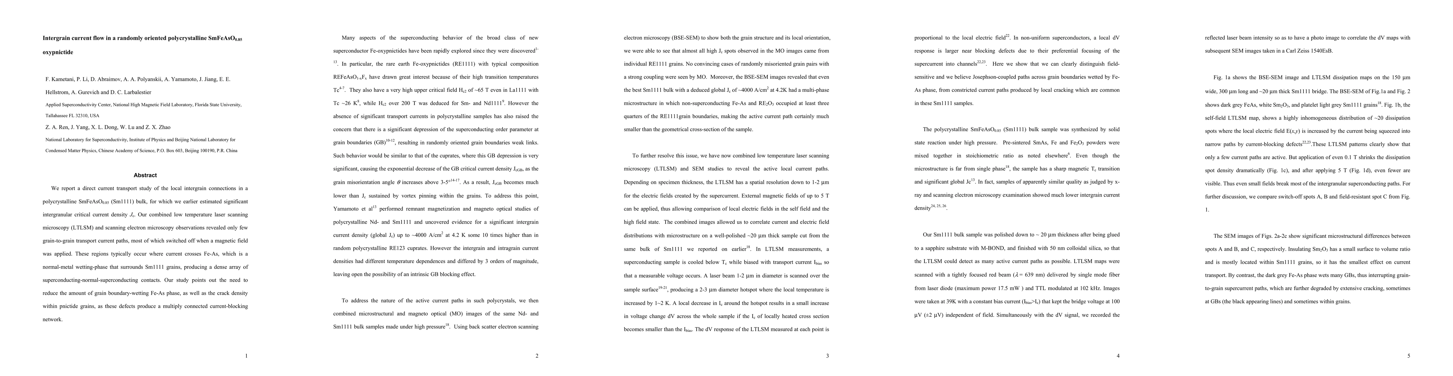 This study investigates the intergrain current flow in polycrystalline SmFeAsO0.85 oxypnictide using low temperature laser scanning microscopy and scanning electron microscopy. The research reveals that most intergrain current paths are blocked by the Fe-As wetting phase and cracks, suggesting that reducing these defects could improve superconducting properties.