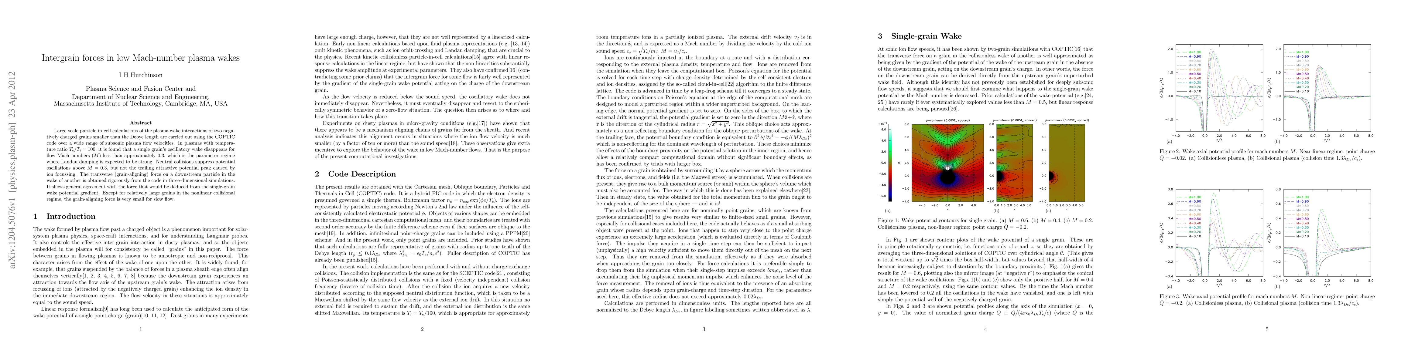 Large-scale particle-in-cell calculations of the plasma wake interactions of two negatively charged grains smaller than the Debye length are carried out using the COPTIC code over a wide range of subsonic plasma flow velocities. In plasmas with temperature ratio $T_e/T_i=100$, it is found that a single grain's oscillatory wake disappears for flow Mach numbers ($M$) less than approximately 0.3, which is the parameter regime where Landau damping is expected to be strong. Neutral collisions suppress potential oscillations above $M=0.3$, but not the trailing attractive potential peak caused by ion focussing. The transverse (grain-aligning) force on a downstream particle in the wake of another is obtained rigorously from the code in three-dimensional simulations. It shows general agreement with the force that would be deduced from the single-grain wake potential gradient. Except for relatively large grains in the nonlinear collisional regime, the grain-aligning force is very small for slow flow.