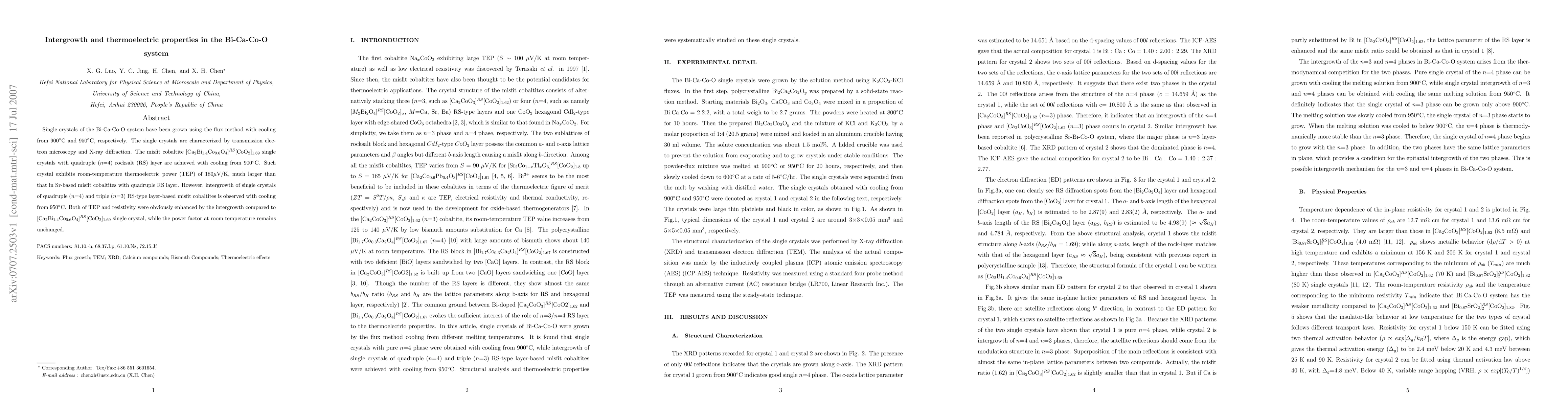 Researchers grew single crystals of Bi-Ca-Co-O using a flux method to achieve high thermoelectric power at room temperature, and found that intergrowth with other crystals enhanced both TEP and resistivity but left the power factor unchanged.