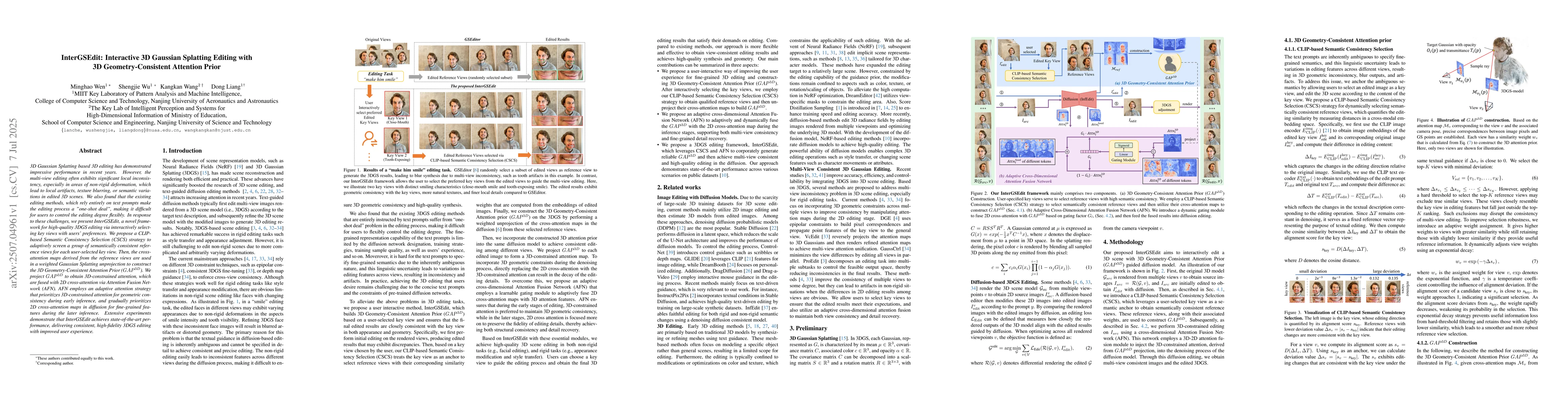 3D Gaussian Splatting based 3D editing has demonstrated impressive performance in recent years. However, the multi-view editing often exhibits significant local inconsistency, especially in areas of non-rigid deformation, which lead to local artifacts, texture blurring, or semantic variations in edited 3D scenes. We also found that the existing editing methods, which rely entirely on text prompts make the editing process a "one-shot deal", making it difficult for users to control the editing degree flexibly. In response to these challenges, we present InterGSEdit, a novel framework for high-quality 3DGS editing via interactively selecting key views with users' preferences. We propose a CLIP-based Semantic Consistency Selection (CSCS) strategy to adaptively screen a group of semantically consistent reference views for each user-selected key view. Then, the cross-attention maps derived from the reference views are used in a weighted Gaussian Splatting unprojection to construct the 3D Geometry-Consistent Attention Prior ($GAP^{3D}$). We project $GAP^{3D}$ to obtain 3D-constrained attention, which are fused with 2D cross-attention via Attention Fusion Network (AFN). AFN employs an adaptive attention strategy that prioritizes 3D-constrained attention for geometric consistency during early inference, and gradually prioritizes 2D cross-attention maps in diffusion for fine-grained features during the later inference. Extensive experiments demonstrate that InterGSEdit achieves state-of-the-art performance, delivering consistent, high-fidelity 3DGS editing with improved user experience.