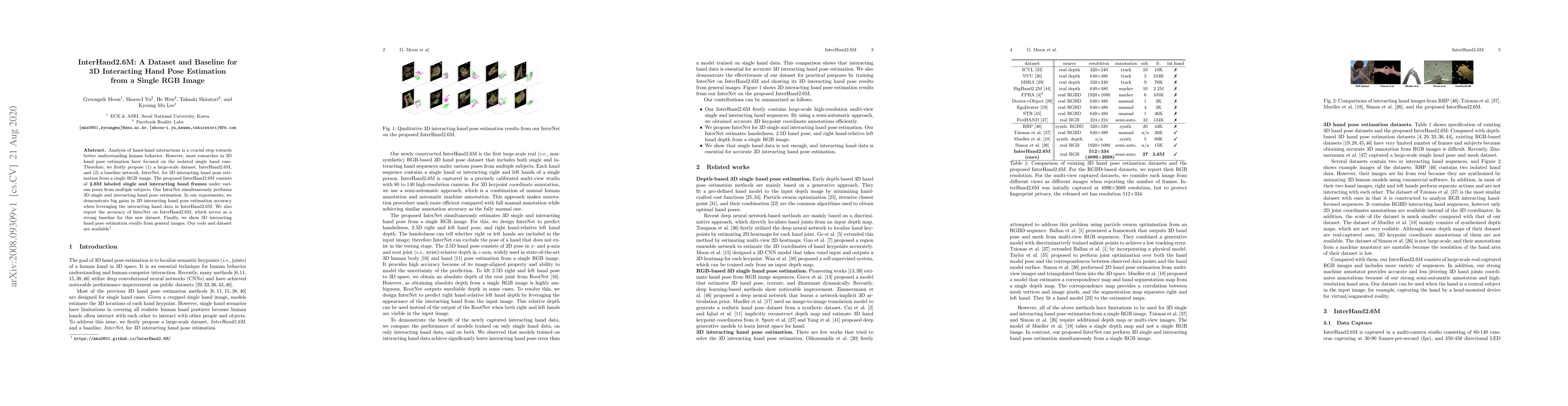 This paper introduces InterHand2.6M, a large dataset of 2.6 million labeled hand frames for 3D pose estimation, and InterNet, a network for estimating 3D interacting hand poses from single RGB images. The dataset and baseline demonstrate significant improvements in accuracy for interacting hand pose estimation.