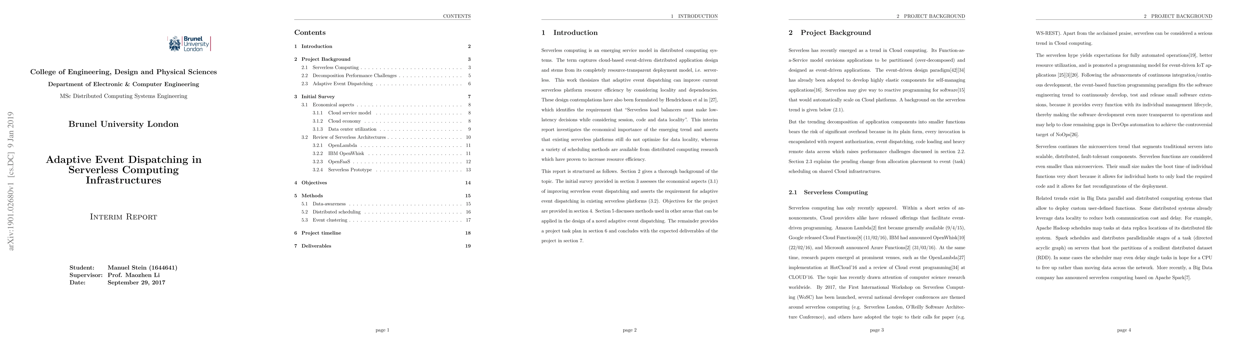 This interim report explores adaptive event dispatching in serverless computing to enhance resource efficiency by optimizing for data locality and dependencies, noting that current platforms lack this optimization despite proven benefits from distributed computing research. The study underscores the importance of low-latency, locality-aware decisions in serverless load balancing.