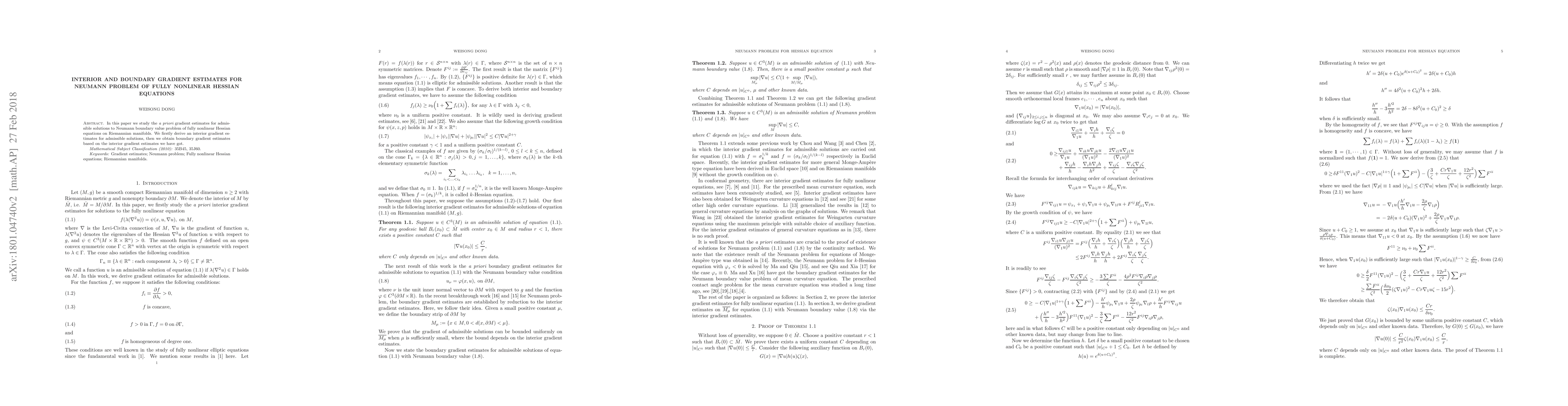 This paper derives interior and boundary gradient estimates for solutions to the Neumann boundary value problem of fully nonlinear Hessian equations on Riemannian manifolds. The key result is the establishment of boundary gradient estimates based on previously obtained interior gradient estimates.