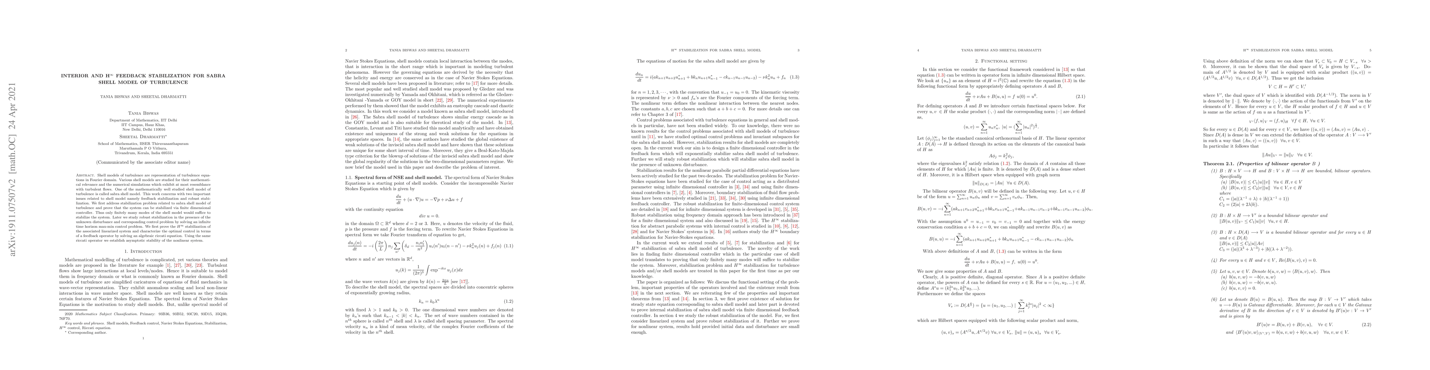 This paper investigates stabilization techniques for the sabra shell model of turbulence, focusing on both internal finite-dimensional controller stabilization and optimal robust control through an infinite time horizon max-min control problem. It proves $H^\infty$ stabilization of the linearized system and demonstrates asymptotic stabilization of the nonlinear system via a feedback operator.