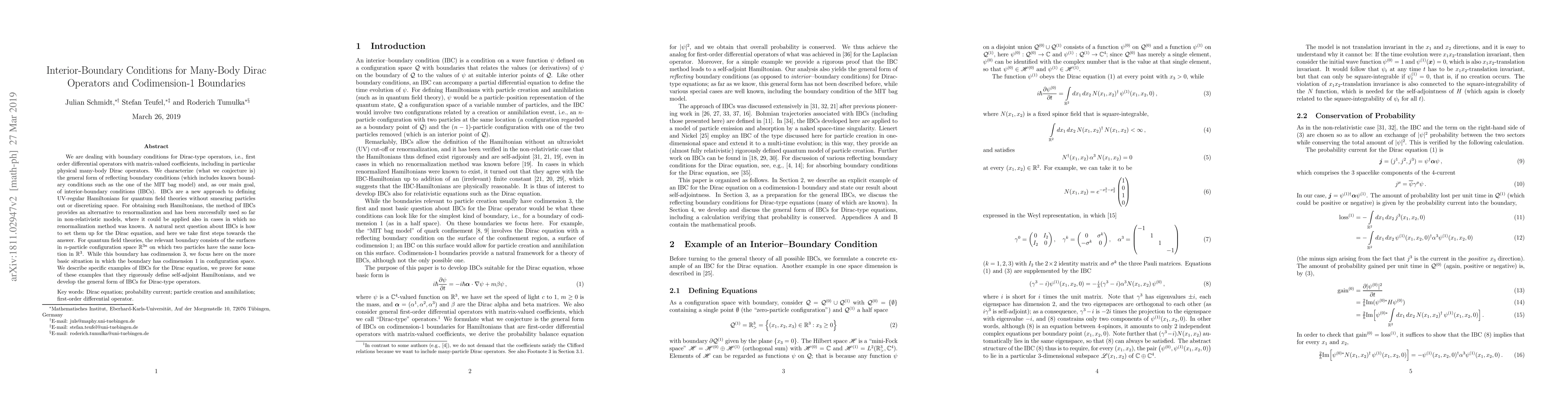 We are dealing with boundary conditions for Dirac-type operators, i.e., first order differential operators with matrix-valued coefficients, including in particular physical many-body Dirac operators. We characterize (what we conjecture is) the general form of reflecting boundary conditions (which includes known boundary conditions such as the one of the MIT bag model) and, as our main goal, of interior-boundary conditions (IBCs). IBCs are a new approach to defining UV-regular Hamiltonians for quantum field theories without smearing particles out or discretizing space. For obtaining such Hamiltonians, the method of IBCs provides an alternative to renormalization and has been successfully used so far in non-relativistic models, where it could be applied also in cases in which no renormalization method was known. A natural next question about IBCs is how to set them up for the Dirac equation, and here we take first steps towards the answer. For quantum field theories, the relevant boundary consists of the surfaces in $n$-particle configuration space $\mathbb{R}^{3n}$ on which two particles have the same location in $\mathbb{R}^3$. While this boundary has codimension 3, we focus here on the more basic situation in which the boundary has codimension 1 in configuration space. We describe specific examples of IBCs for the Dirac equation, we prove for some of these examples that they rigorously define self-adjoint Hamiltonians, and we develop the general form of IBCs for Dirac-type operators.
