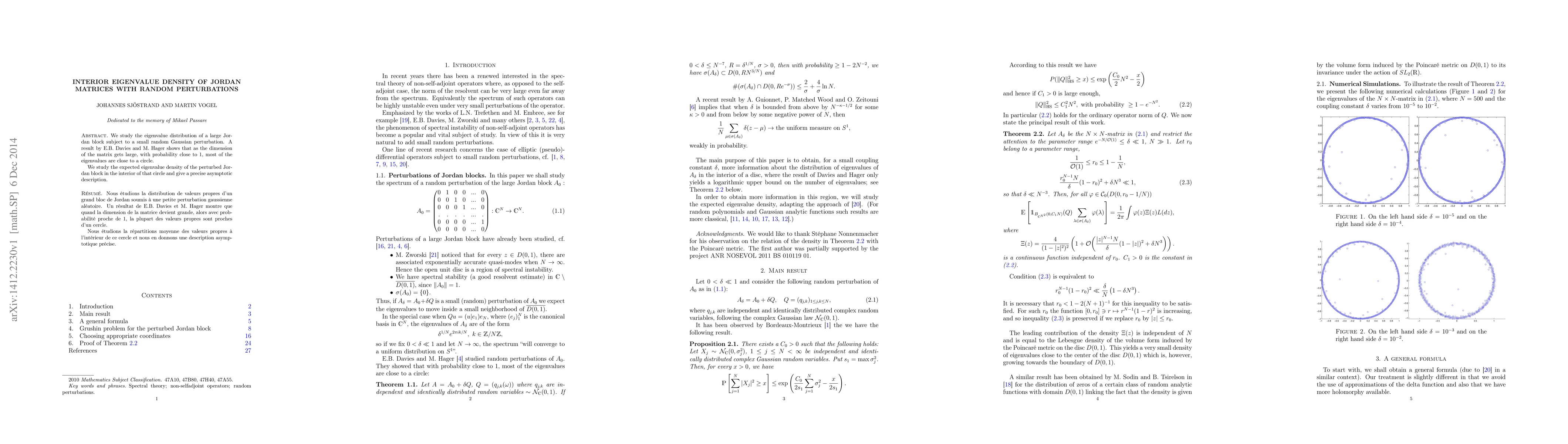 This paper investigates the eigenvalue distribution of large Jordan blocks with small random Gaussian perturbations, focusing on the expected eigenvalue density within the interior of the circle where most eigenvalues cluster as the matrix dimension increases. It provides an asymptotic description of this density.