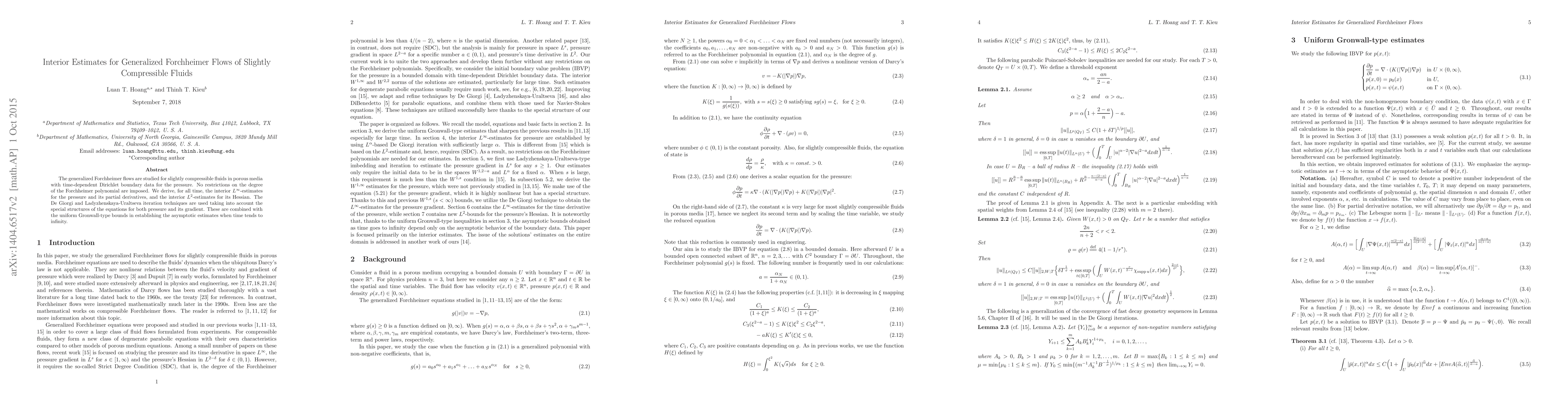 The generalized Forchheimer flows are studied for slightly compressible fluids in porous media with time-dependent Dirichlet boundary data for the pressure. No restrictions on the degree of the Forchheimer polynomial are imposed. We derive, for all time, the interior $L^\infty$-estimates for the pressure and its partial derivatives, and the interior $L^2$-estimates for its Hessian. The De Giorgi and Ladyzhenskaya-Uraltseva iteration techniques are used taking into account the special structures of the equations for both pressure and its gradient. These are combined with the uniform Gronwall-type bounds in establishing the asymptotic estimates when time tends to infinity.